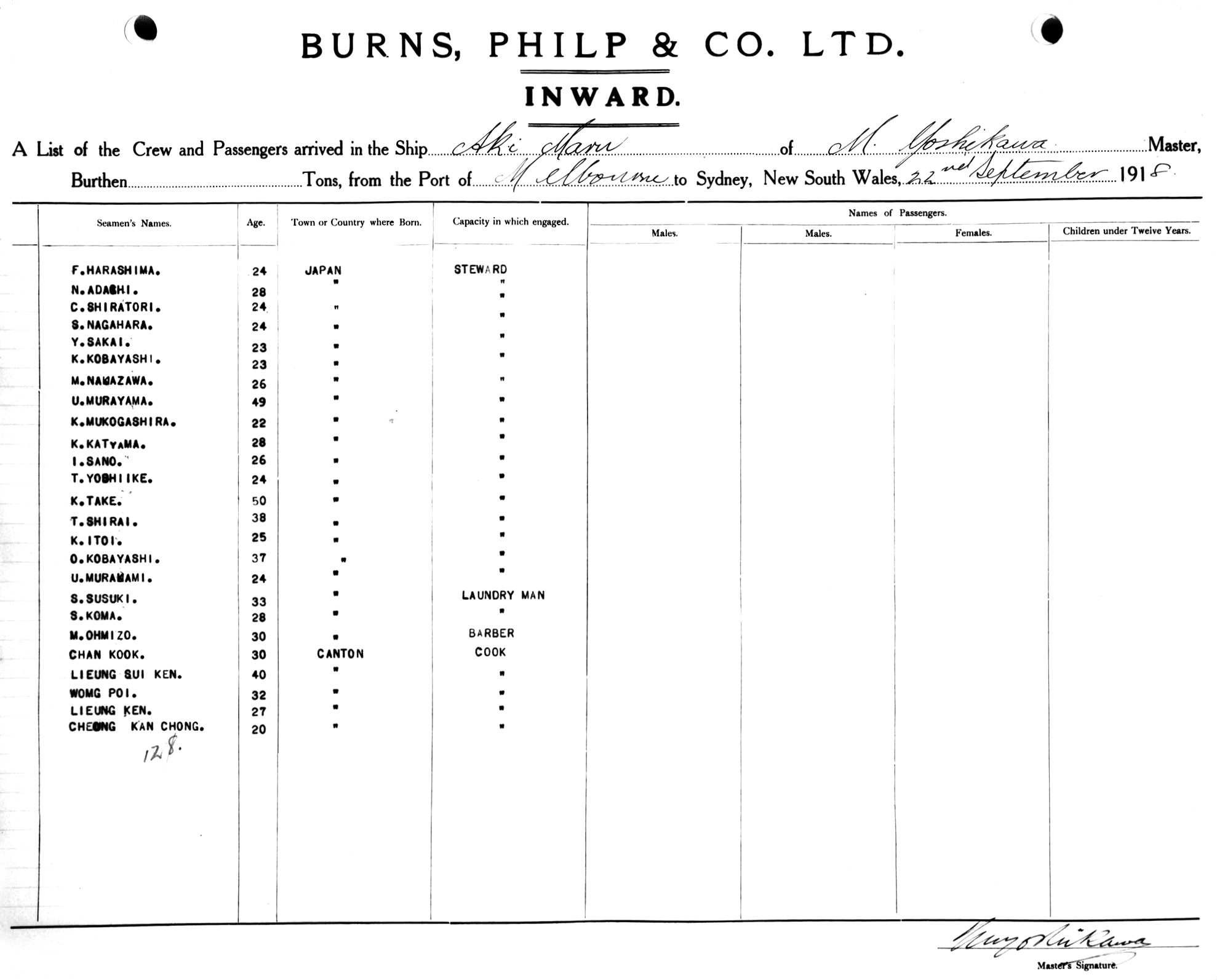 AKI MARUOF JAPAN, M. YOSHIKAWA, MASTER, BURTHEN 6009/3676 TONS FROM THE PORT OF MELBOURNE TO SYDNEY, NEW SOUTH WALES, 22ND SEPTEMBER, 1918 |