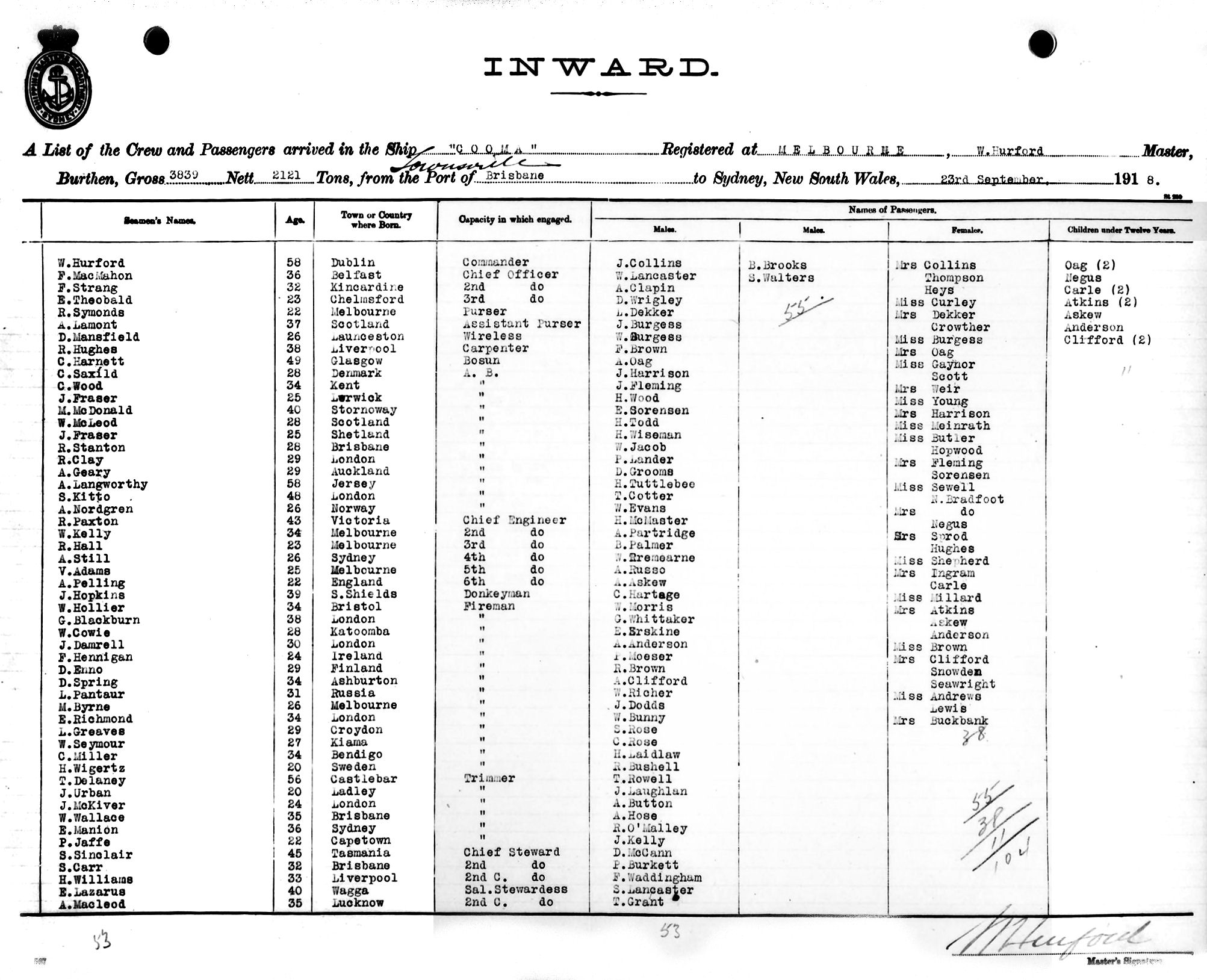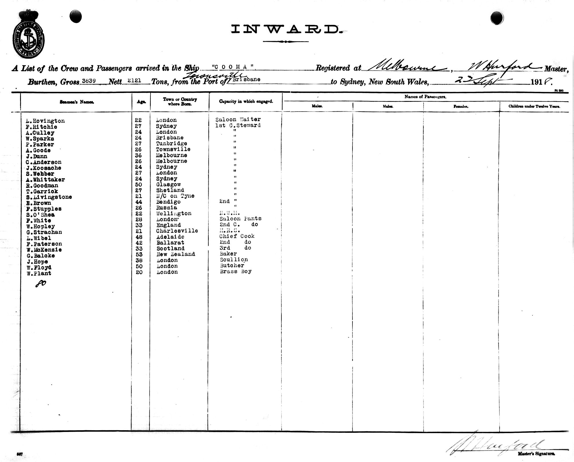 COOMAOF MELBOURNE, W. HURFORD, MASTER, BURTHEN 3839/2121 TONS FROM THE PORTS OF BRISBANE & TOWNSVILLE TO SYDNEY, NEW SOUTH WALES, 23RD SEPTEMBER, 1918 |
