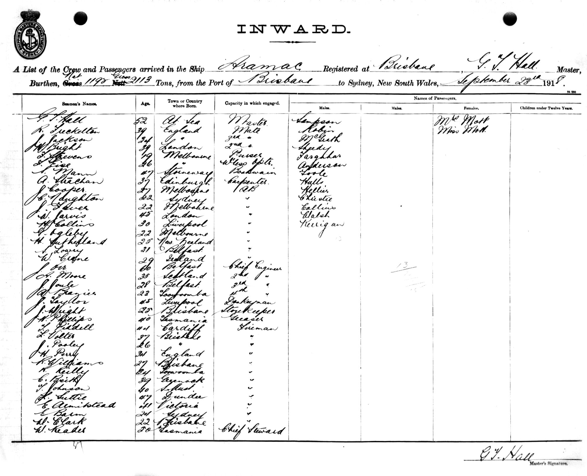 ARAMACOF BRISBANE, G. T. HALL, MASTER, BURTHEN 2113/1192 TONS FROM THE PORT OF BRISBANE TO SYDNEY, NEW SOUTH WALES, 23RD SEPTEMBER, 1918 |