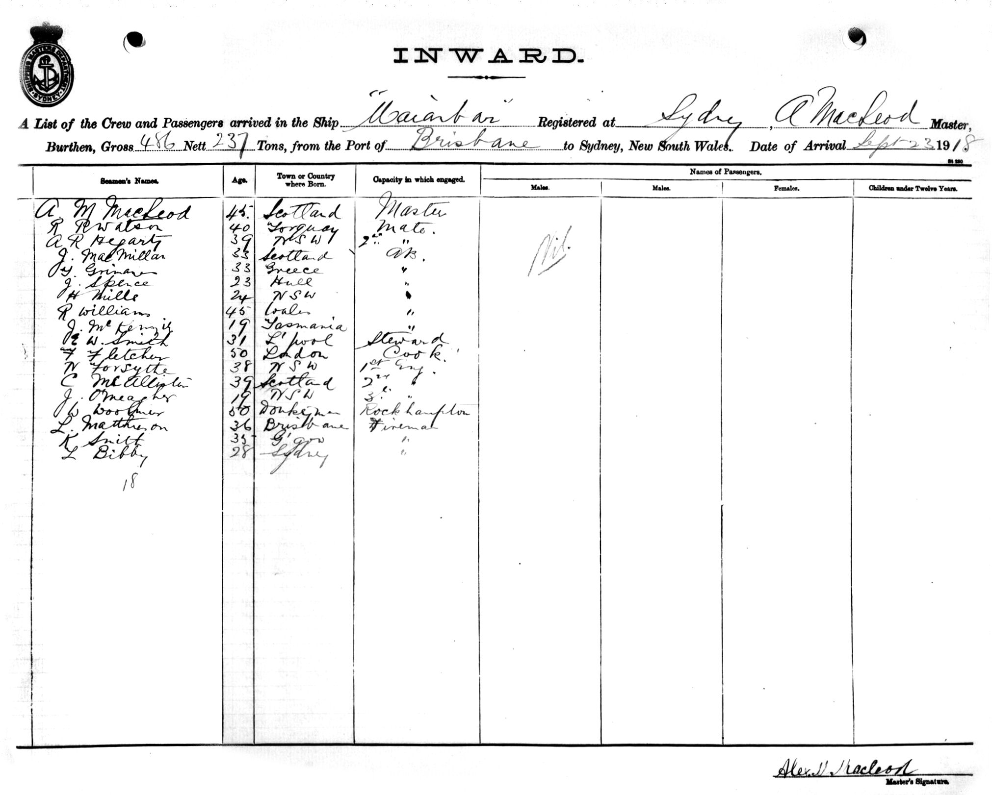 MAIANBAROF SYDNEY, A. MACLEOD, MASTER, BURTHEN 486/237 TONS FROM THE PORT OF BRISBANE TO SYDNEY, NEW SOUTH WALES, 23RD SEPTEMBER, 1918 |