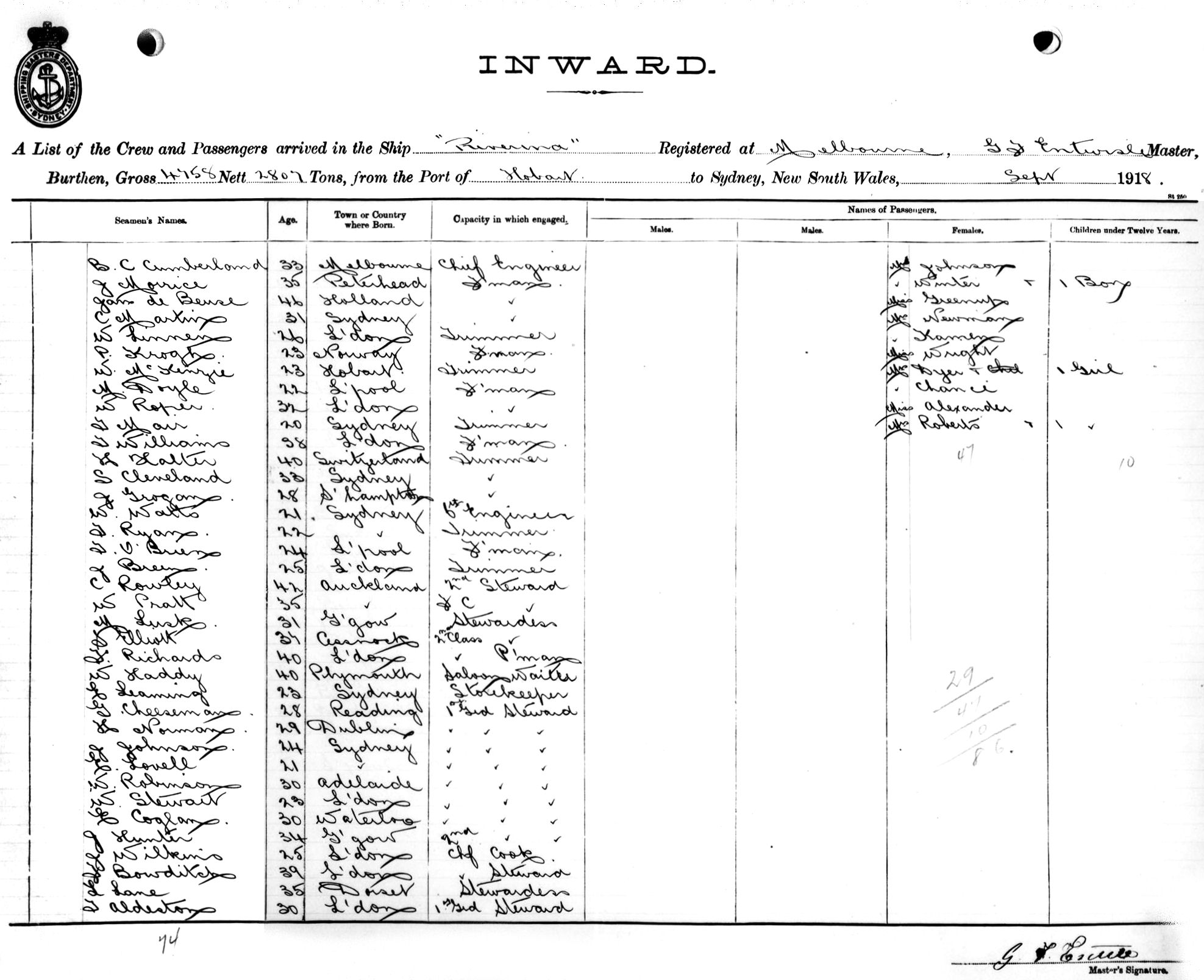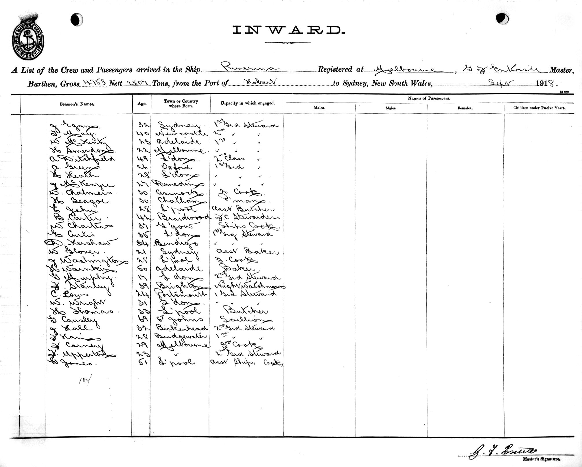 RIVERINAOF MELBOURNE, G. F. ENTWISLE, MASTER, BURTHEN 4758/2807 TONS FROM THE PORT OF HOBART TO SYDNEY, NEW SOUTH WALES, (23RD) SEPTEMBER, 1918 |