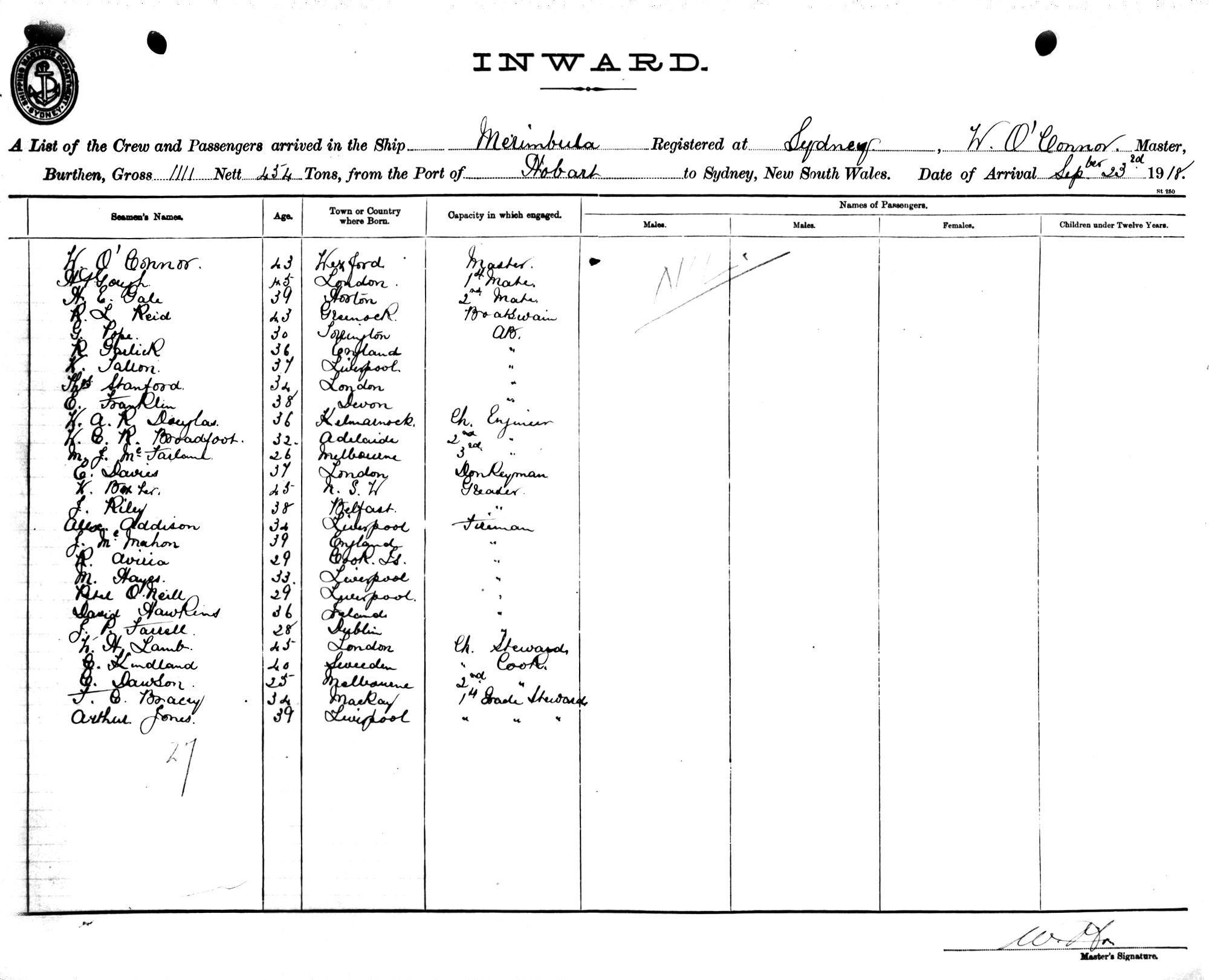 MERIMBULAOF SYDNEY, W. O'CONNOR, MASTER, BURTHEN 1111/454 TONS FROM THE PORT OF HOBART TO SYDNEY, NEW SOUTH WALES, 23RD SEPTEMBER, 1918 |