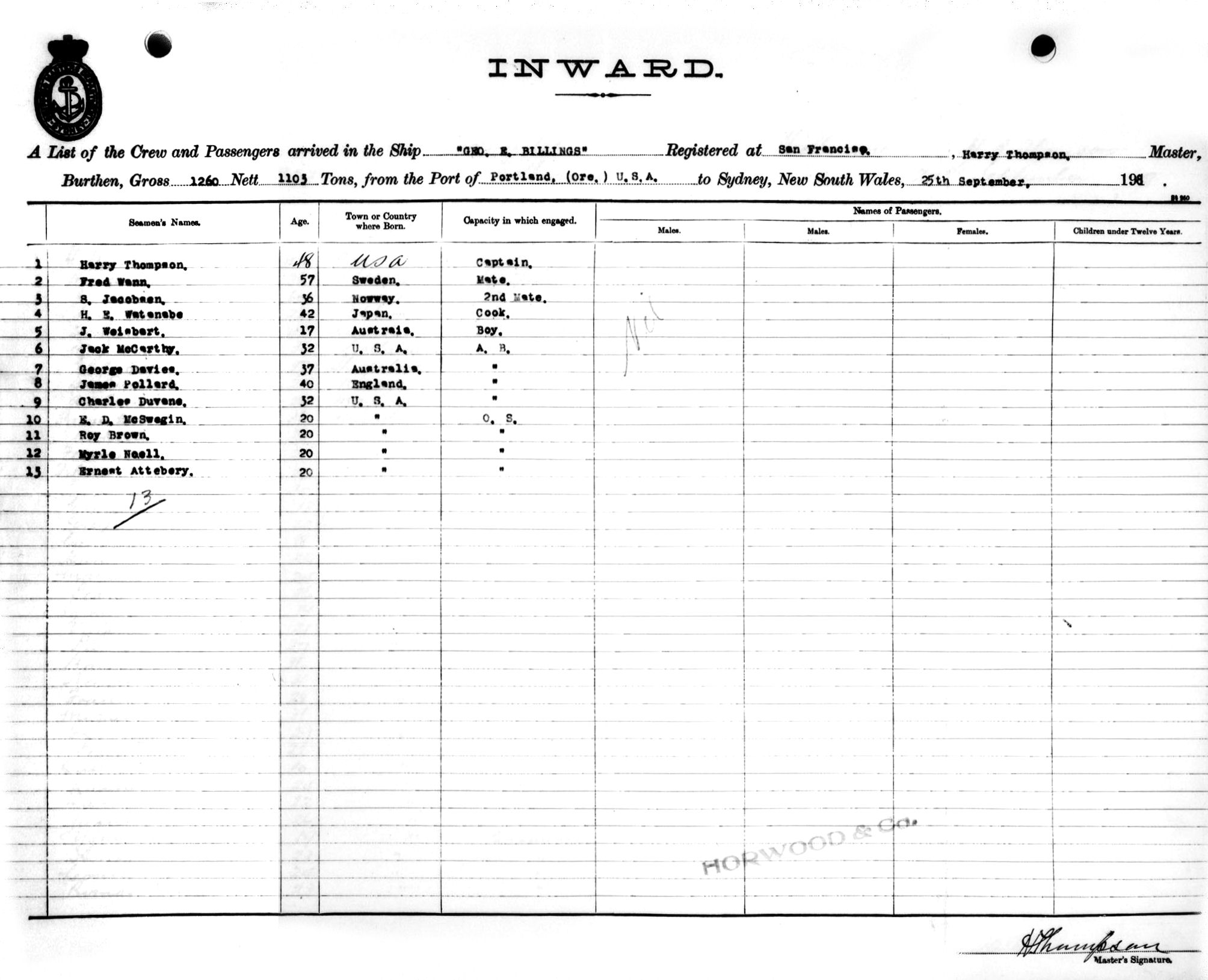 GEORGE E BILLINGSOF SAN FRANCISCO, HARRY THOMPSON, MASTER, BURTHEN 1260/1103 TONS FROM THE PORT OF PORTLAND, OREGON TO SYDNEY, NEW SOUTH WALES, 25TH SEPTEMBER, 1918 |