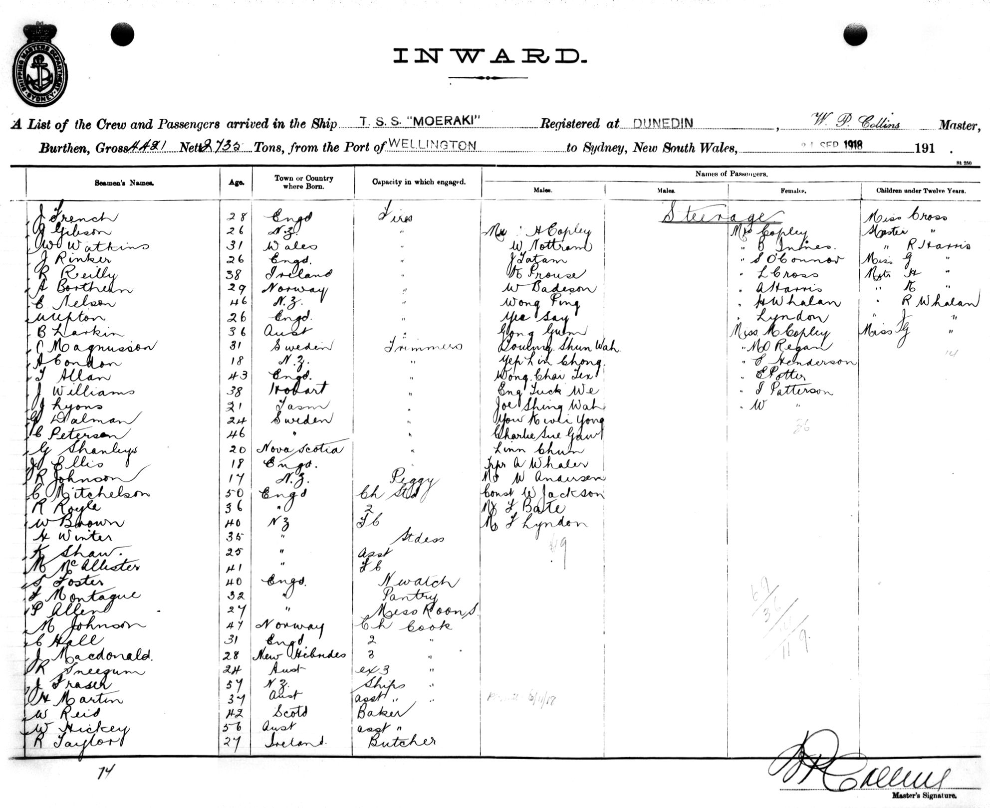 MOERAKIOF DUNEDIN, W. P. COLLINS, MASTER, BURTHEN 4421/2735 TONS FROM THE PORT OF WELLINGTON TO SYDNEY, NEW SOUTH WALES, 24TH SEPTEMBER, 1918 |