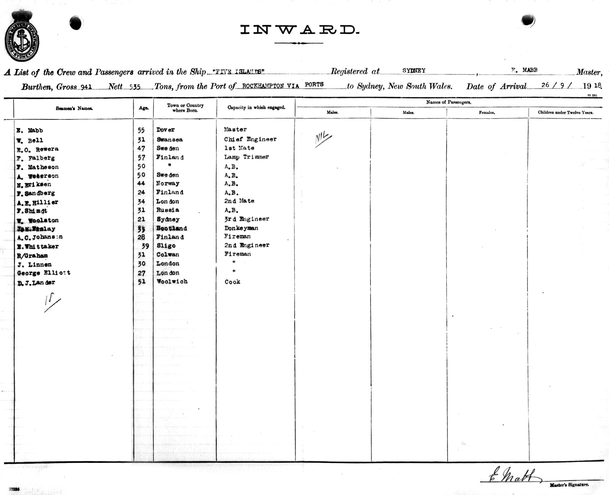 FIVE ISLANDSOF SYDNEY, E. MABB, MASTER, BURTHEN 941/535 TONS FROM THE PORT OF ROCKHAMPTON VIA PORTS TO SYDNEY, NEW SOUTH WALES, 26TH SEPTEMBER, 1918 |