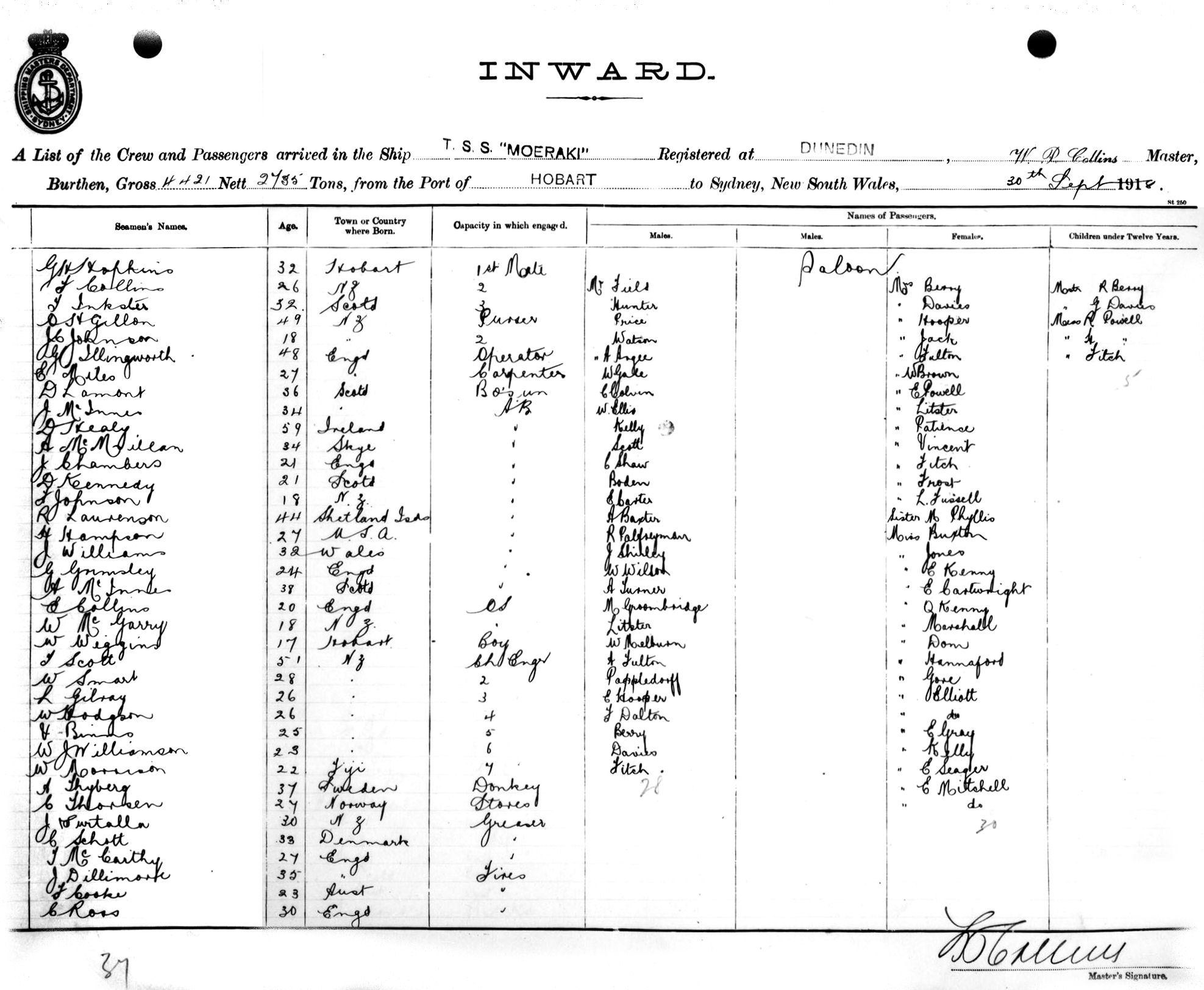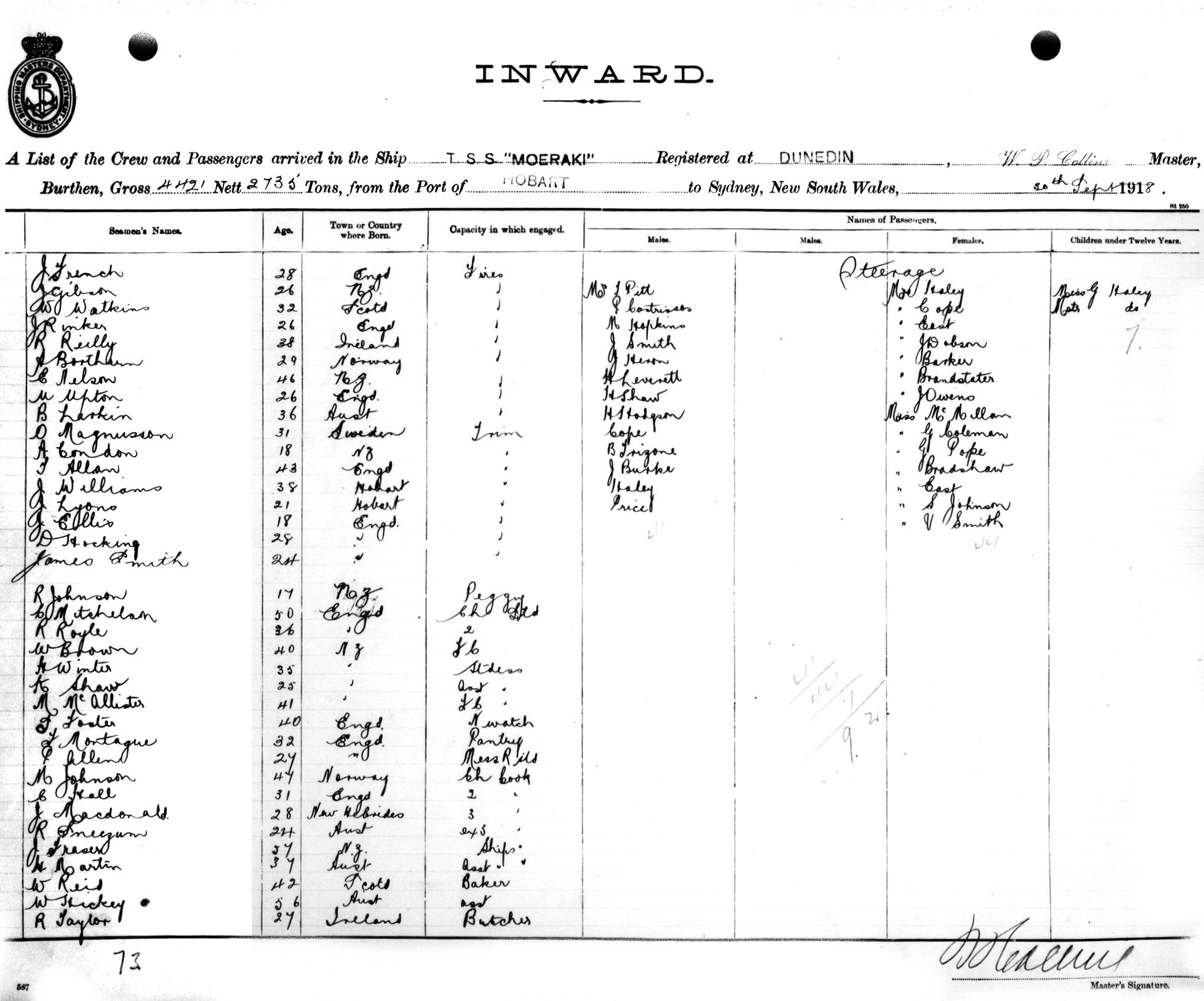 MOERAKIOF DUNEDIN, W. P. COLLINS, MASTER, BURTHEN 4421/2735 TONS FROM THE PORT OF HOBART TO SYDNEY, NEW SOUTH WALES, 30TH SEPTEMBER, 1918 |