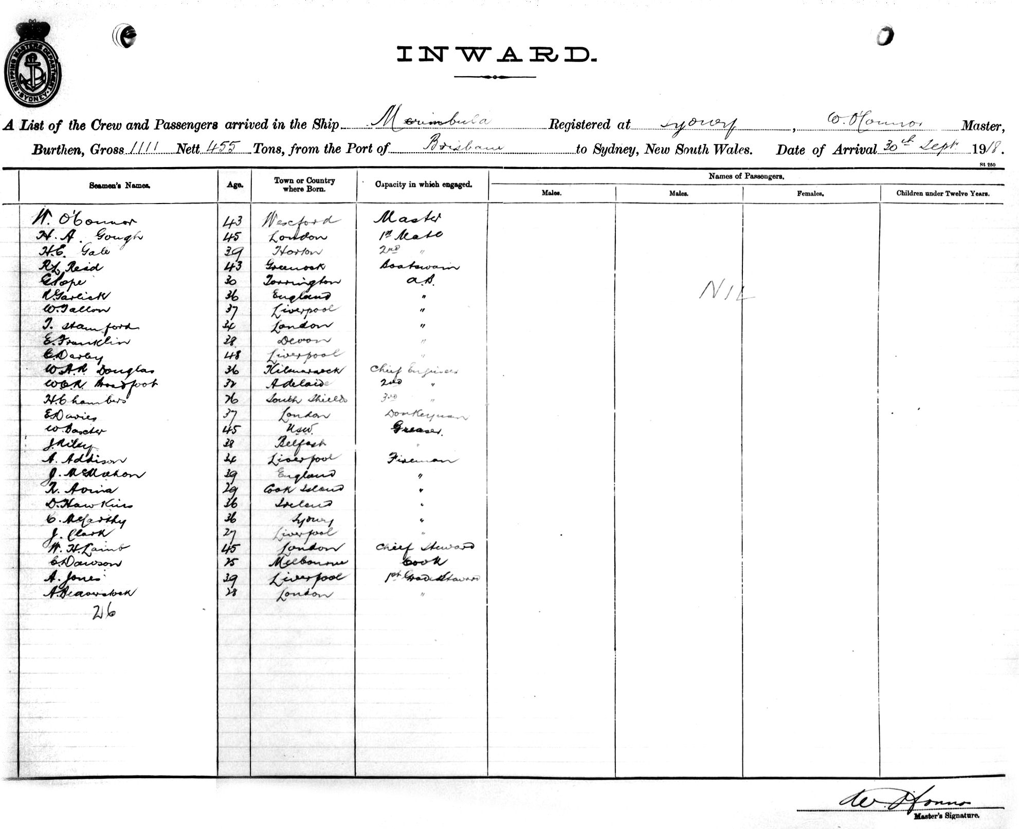 MERIMBULAOF SYDNEY, W. O'CONNOR, MASTER, BURTHEN 1111/455 TONS FROM THE PORT OF BRISBANE TO SYDNEY, NEW SOUTH WALES, 30TH SEPTEMBER, 1918 |