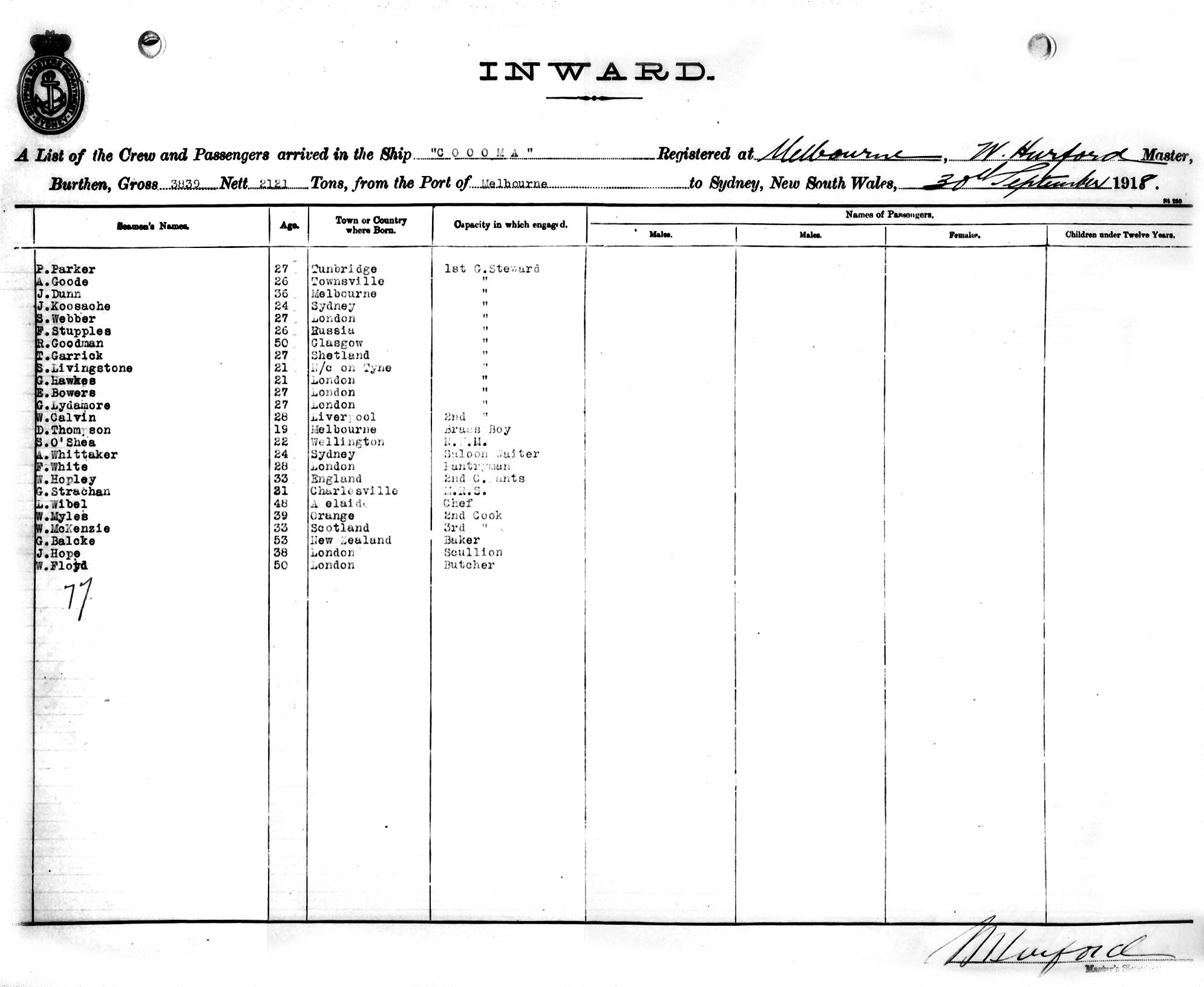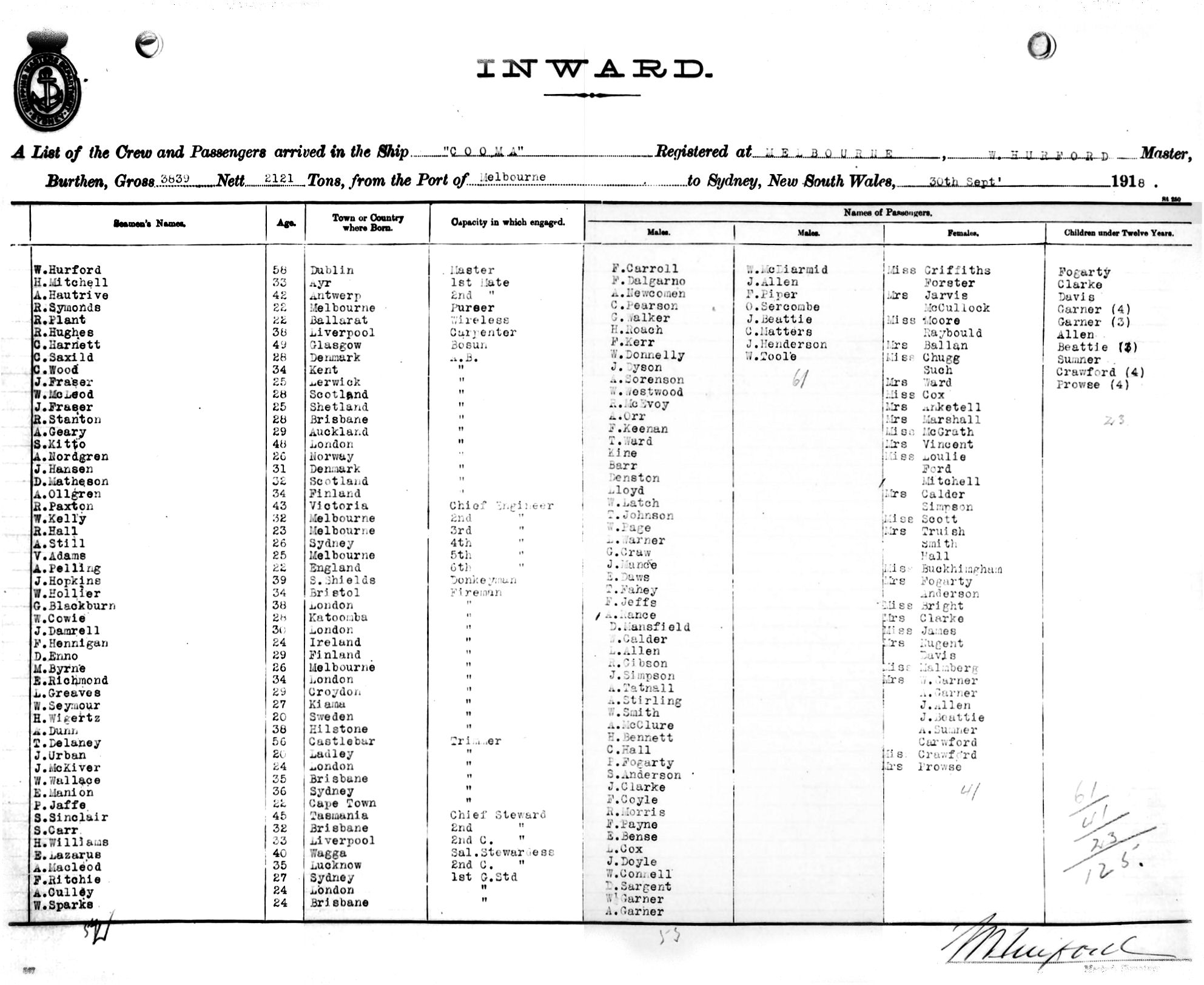 COOMAOF MELBOURNE, W. HURFORD, MASTER, BURTHEN 3839/2121 TONS FROM THE PORT OF MELBOURNE TO SYDNEY, NEW SOUTH WALES, 30TH SEPTEMBER,1918 |