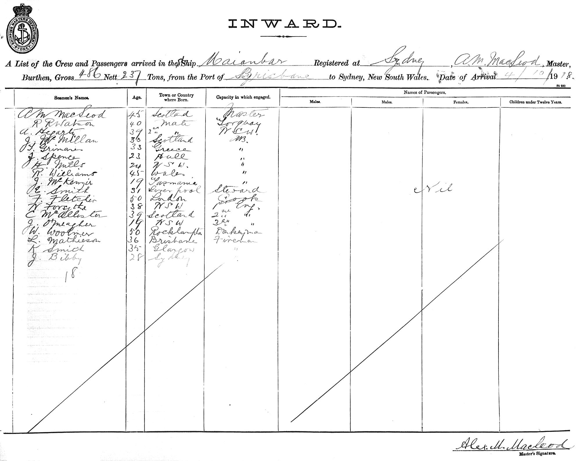 MAIANBAROF SYDNEY, A. M. MACLEOD, MASTER, BURTHEN 486/237 TONS FROM THE PORT OF BRISBANE TO SYDNEY, NEW SOUTH WALES, 4TH OCTOBER 1918 |