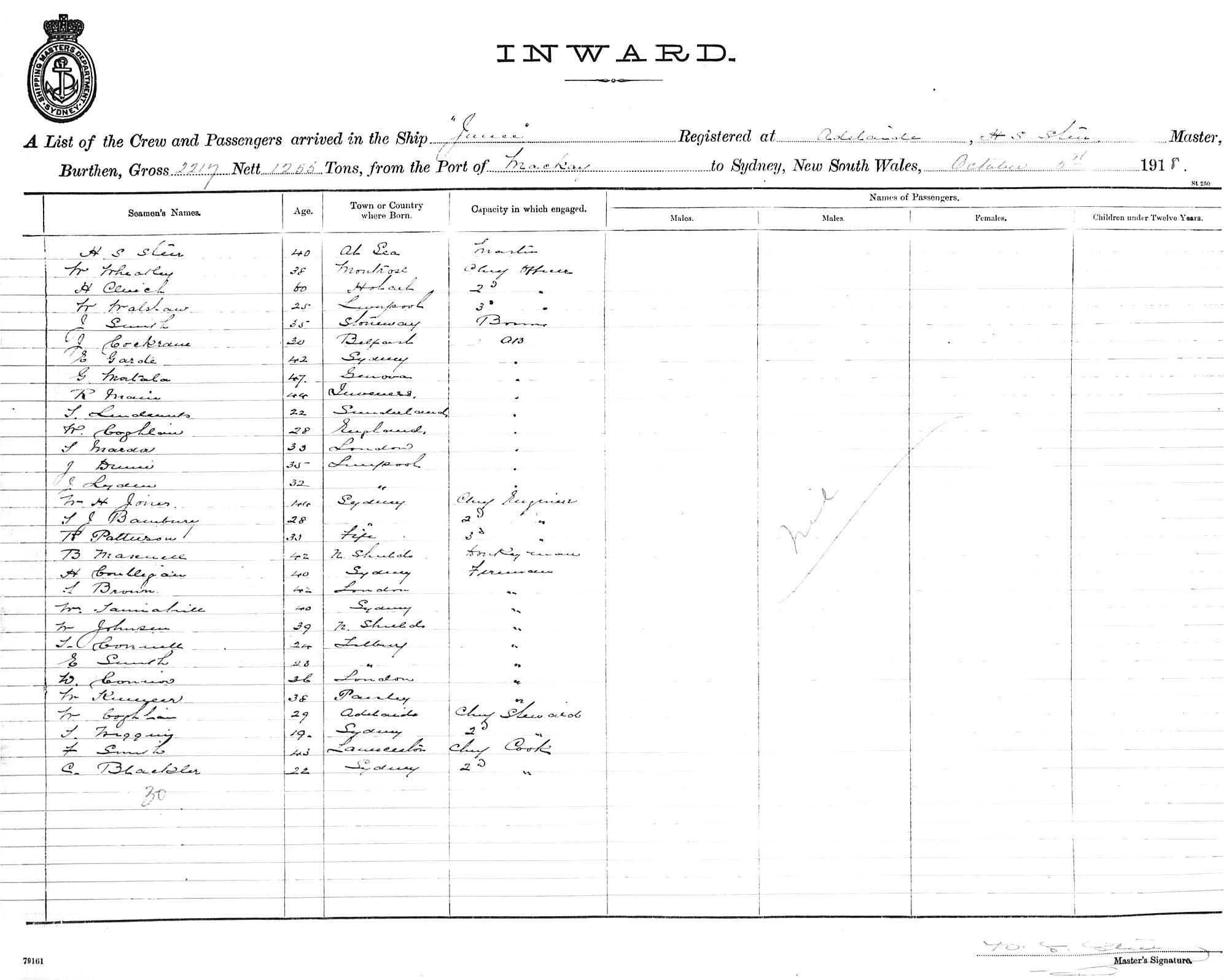 Source: State Records Authority of New South Wales: Shipping Master's Office; Passengers Arriving 1855 - 1922; NRS13278, [X433] reels 2103 & 2104. Transcribed by Lyn & Maurie. You may view/print a scan of the original list - a monitor set to high resolution is recommended for clarity. Use your back button to return. |