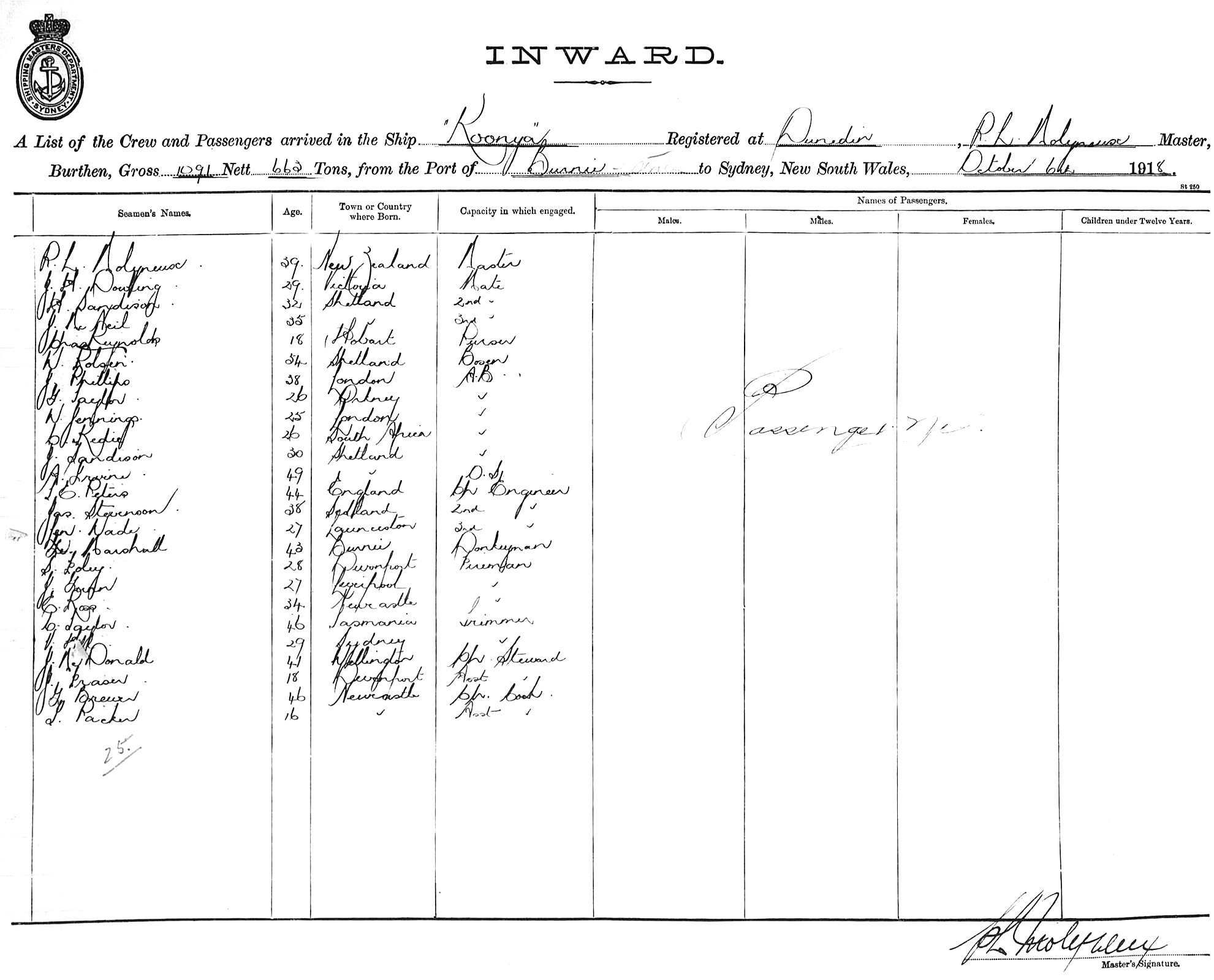 KOONYAOF DUNEDIN, P. L. MOLYNEUX, MASTER, BURTHEN 1091/663 TONS FROM THE PORT OF BURNIE TO SYDNEY, NEW SOUTH WALES, 6TH OCTOBER 1918 |