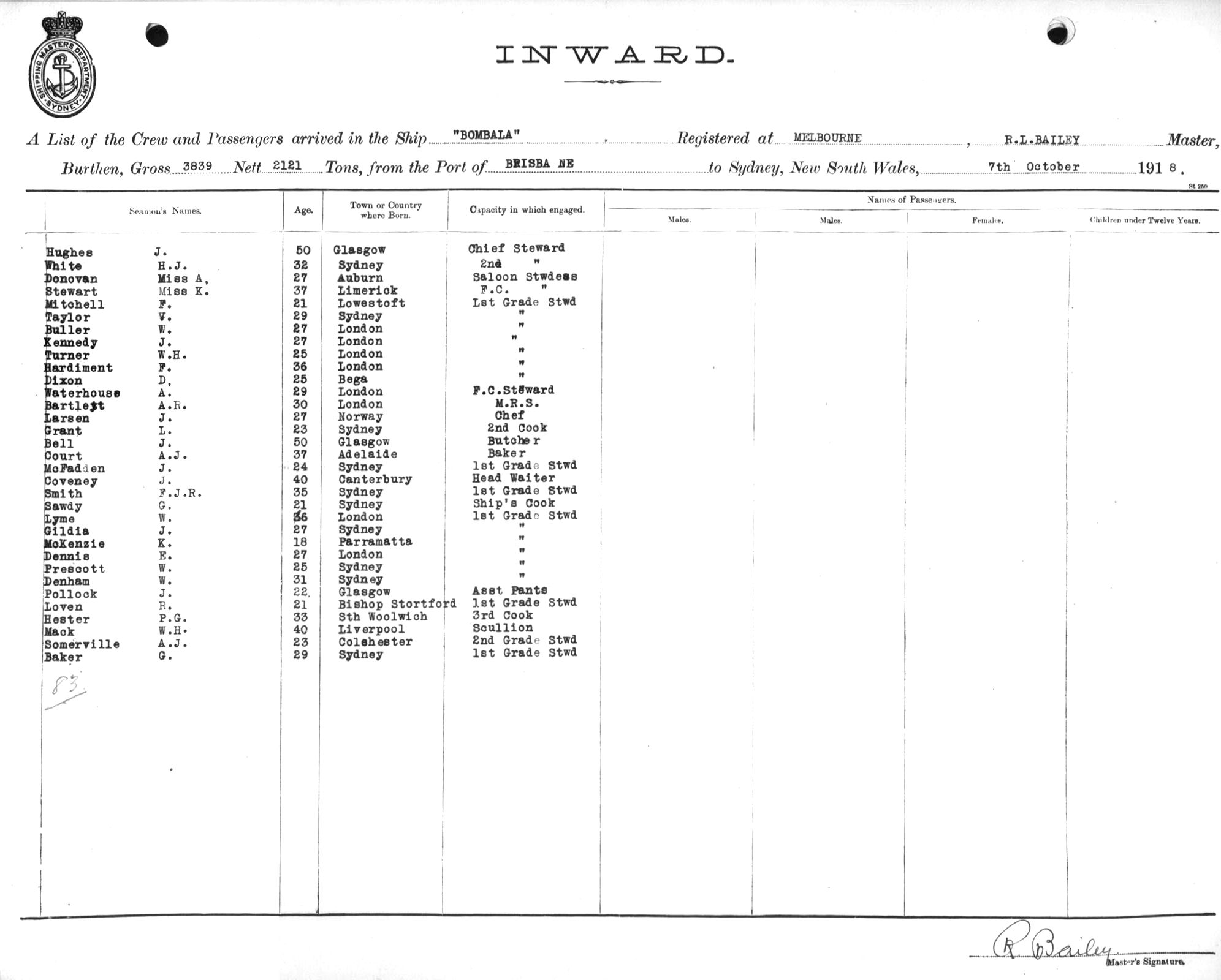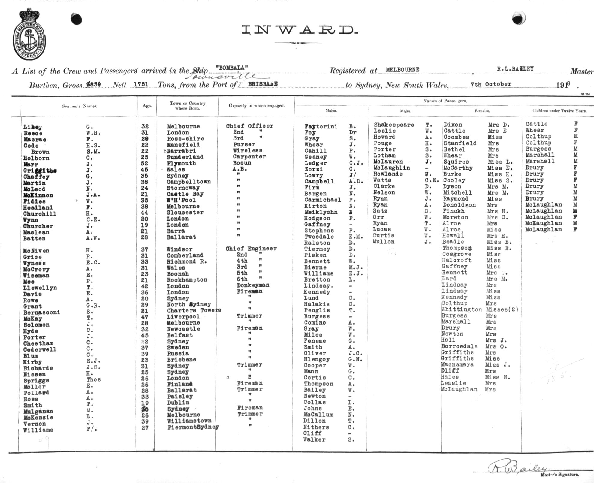 BOMBALAOF MELBOURNE, R. L. BAILEY, MASTER, BURTHEN 3839/1751 TONS FROM THE PORT OF TOWNSVILLE via BRISBANE TO SYDNEY, NEW SOUTH WALES, 7TH OCTOBER 1918 |