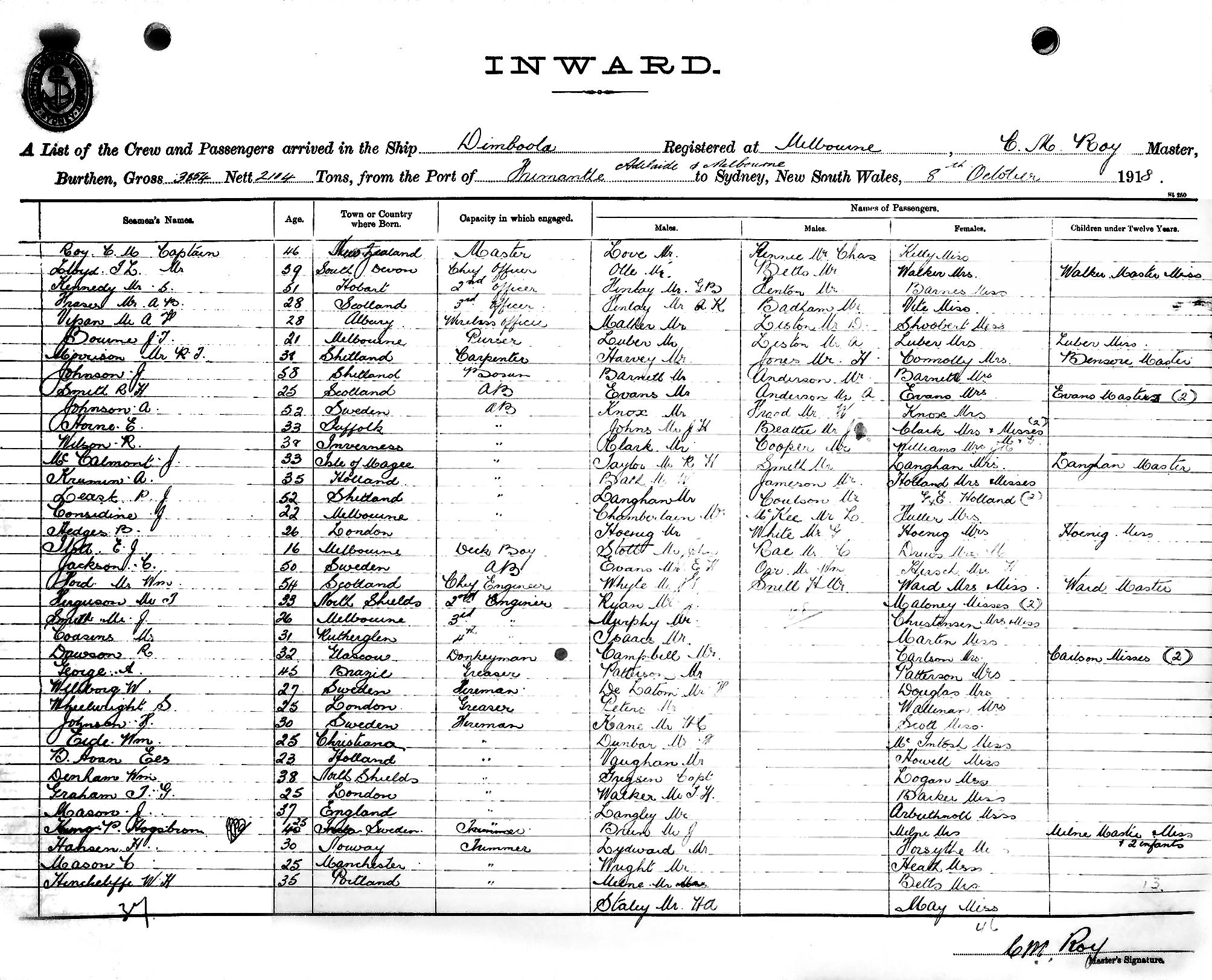 DIMBOOLAOF MELBOURNE, C. M. ROY, MASTER, BURTHEN 3854/2114 TONS FROM THE PORTS OF FREMANTLE, ADELAIDE & MELBOURNE TO SYDNEY, NEW SOUTH WALES, 8TH OCTOBER 1918 |