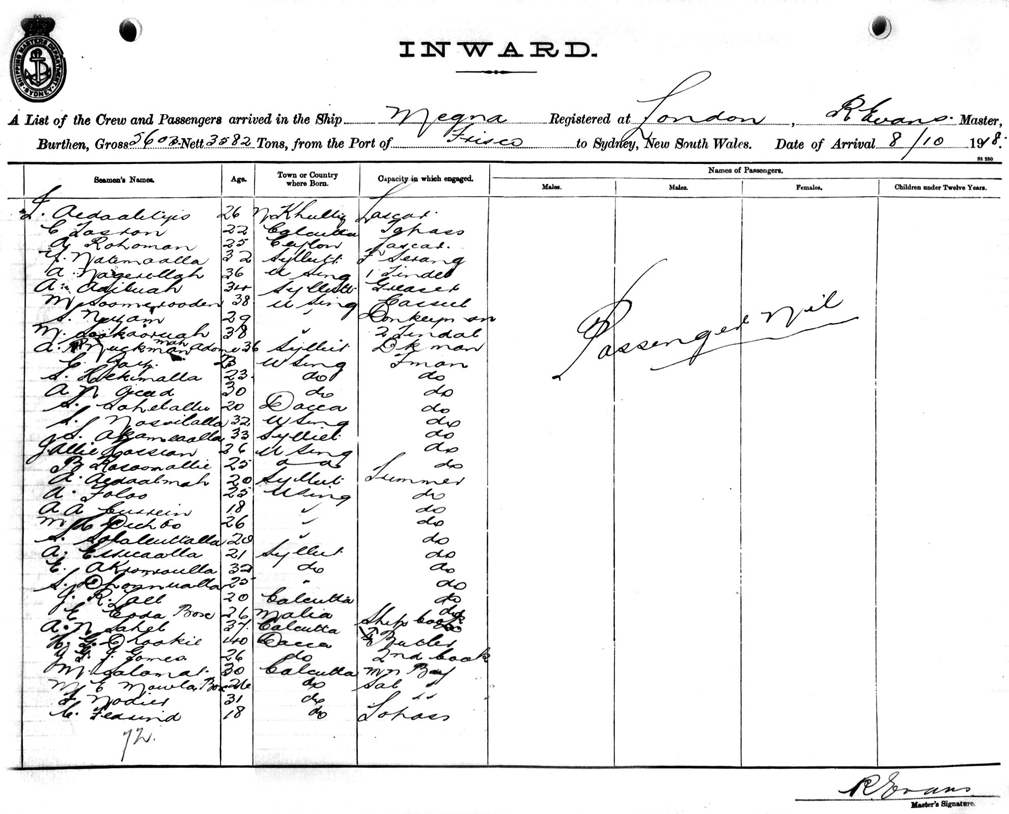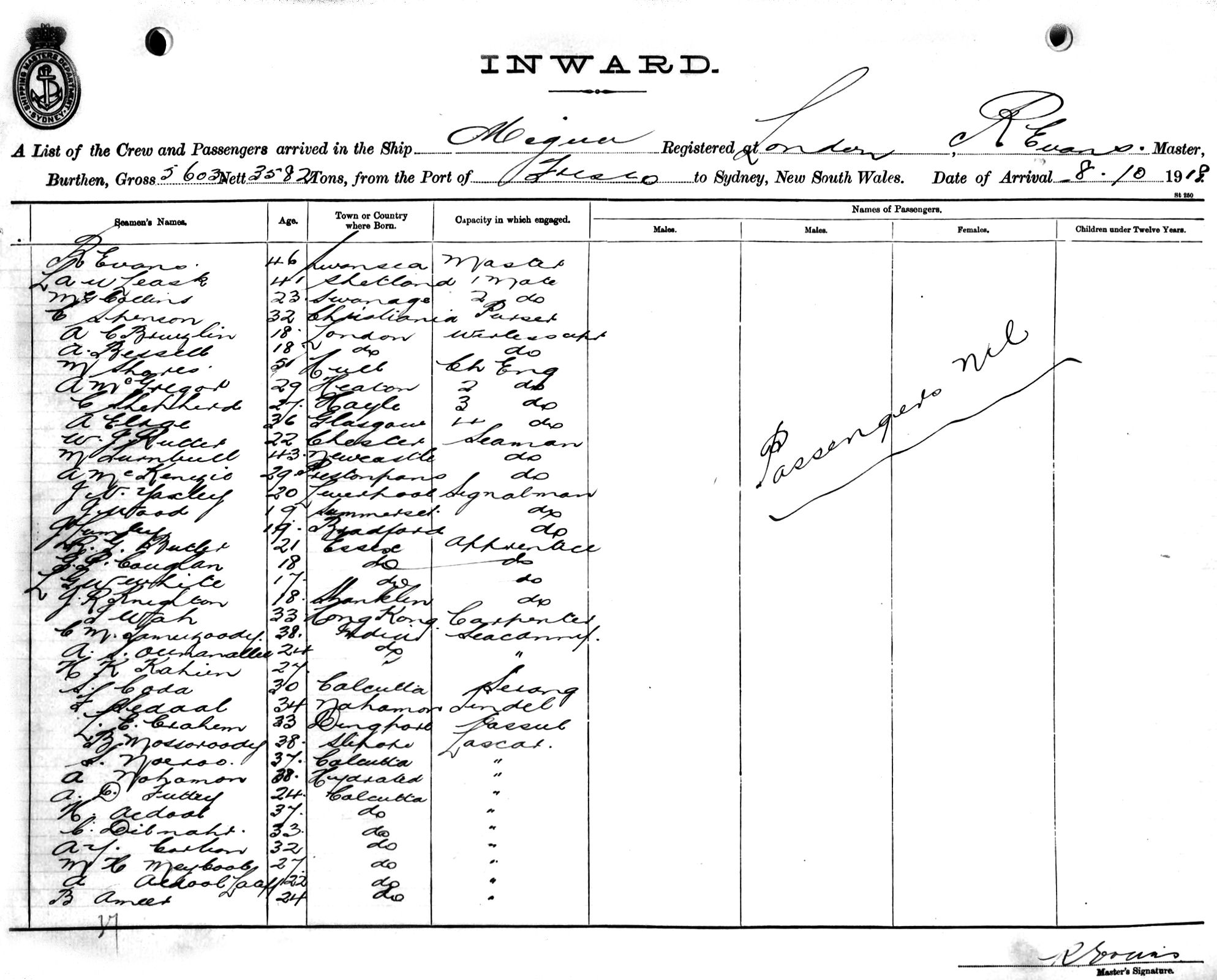 MEGNAOF LONDON, R. EVANS, MASTER, BURTHEN 5603/3582 TONS FROM THE PORT OF SAN FRANCISCO TO SYDNEY, NEW SOUTH WALES, 8TH OCTOBER 1918 |