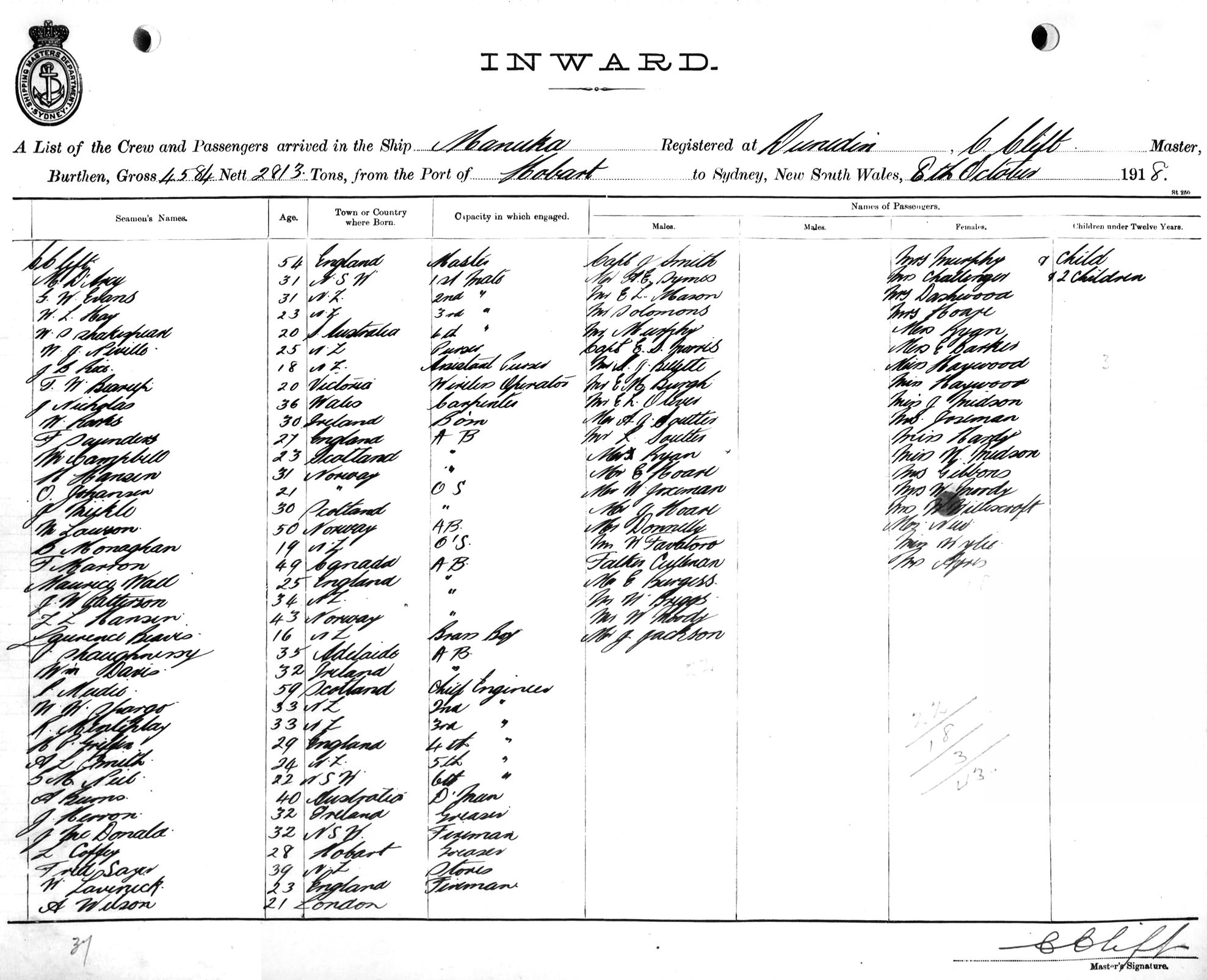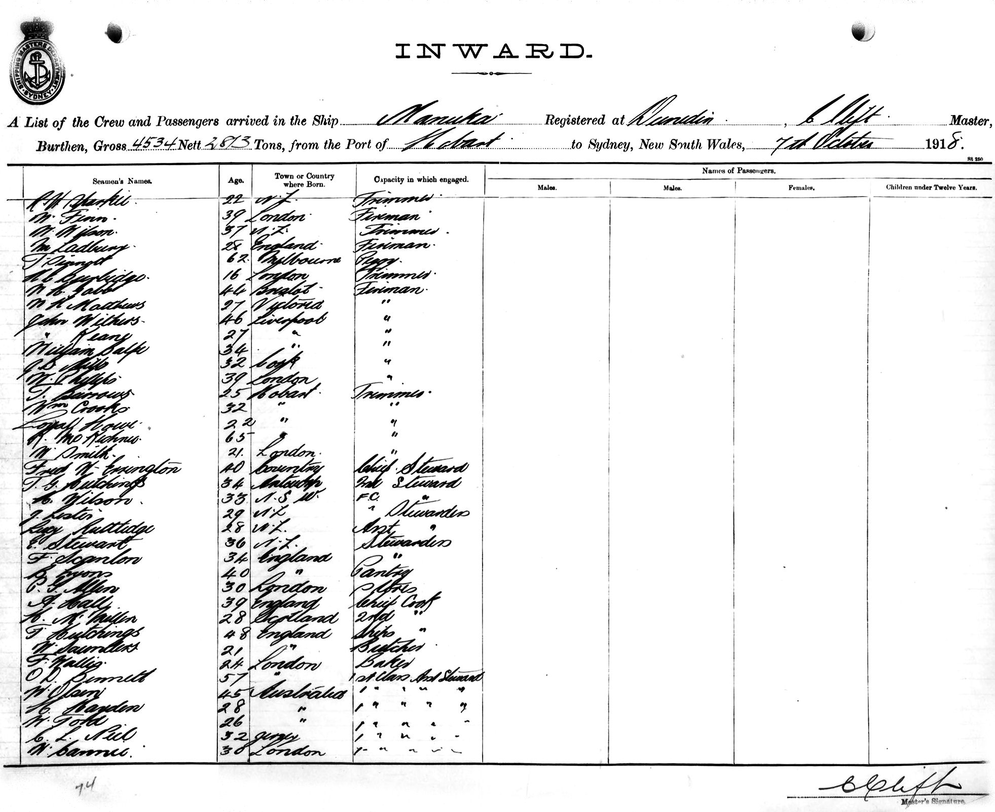 MANUKAOF DUNEDIN, C. CLIFT, MASTER, BURTHEN 4584/2813 TONS FROM THE PORT OF HOBART TO SYDNEY, NEW SOUTH WALES, 8TH OCTOBER 1918 |