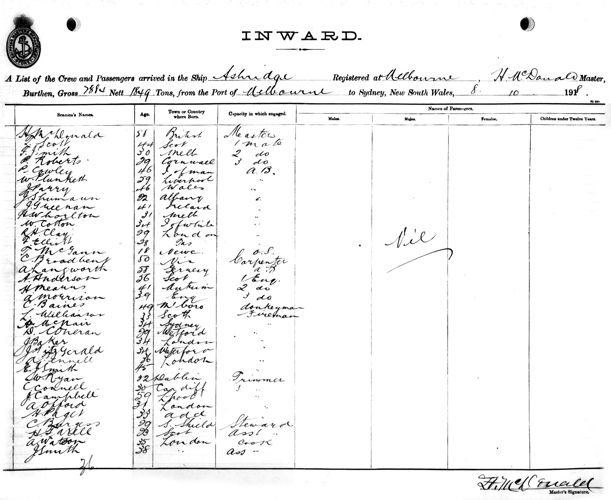 ASHRIDGEOF MELBOURNE, H. MCDONALD, MASTER, BURTHEN 2884/1849 TONS FROM THE PORT OF MELBOURNE TO SYDNEY, NEW SOUTH WALES, 8TH OCTOBER 1918 |