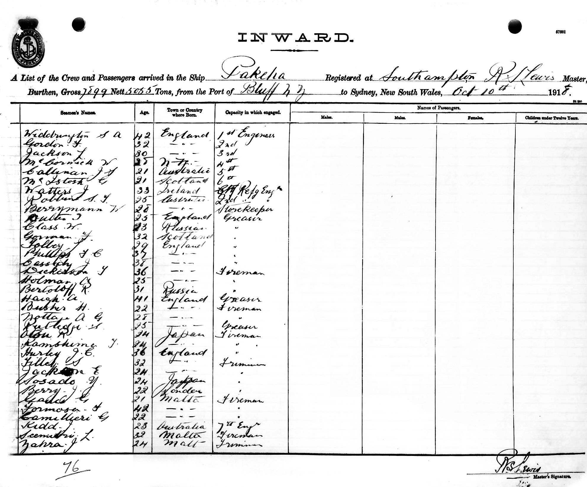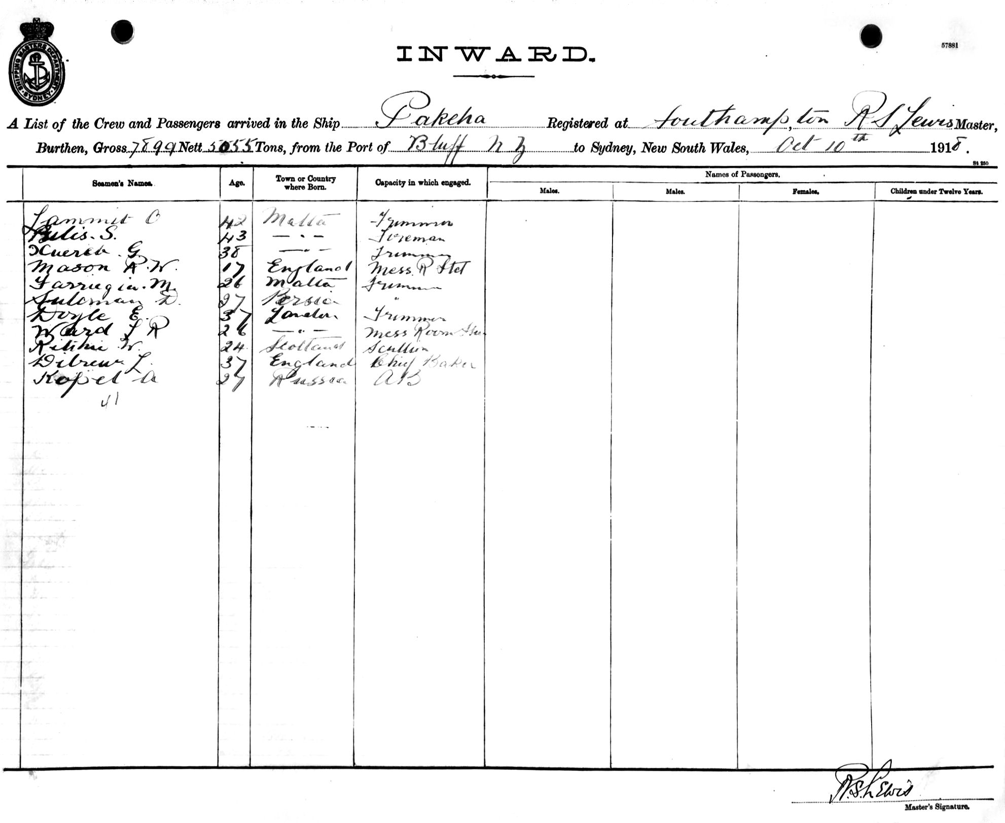 PAKEHAOF SOUTHAMPTON, R. S. LEWIS, MASTER, BURTHEN 7199/5055 TONS FROM THE PORT OF BLUFF & N.Z. PORTS TO SYDNEY, NEW SOUTH WALES, 10TH OCTOBER 1918 |