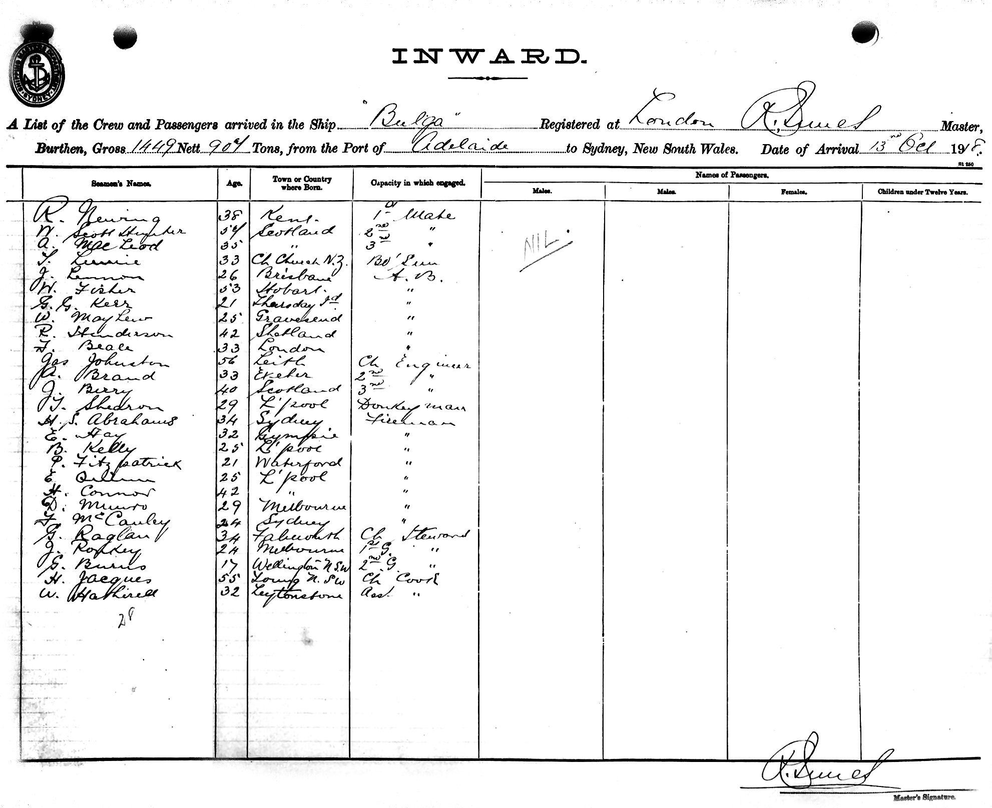Mariners and ships in Australian Waters | BULGAOF LONDON, R. INNES, MASTER, BURTHEN 68 TONS FROM THE PORT OF ADELAIDE TO SYDNEY, NEW SOUTH WALES, 13TH OCTOBER 1918 |