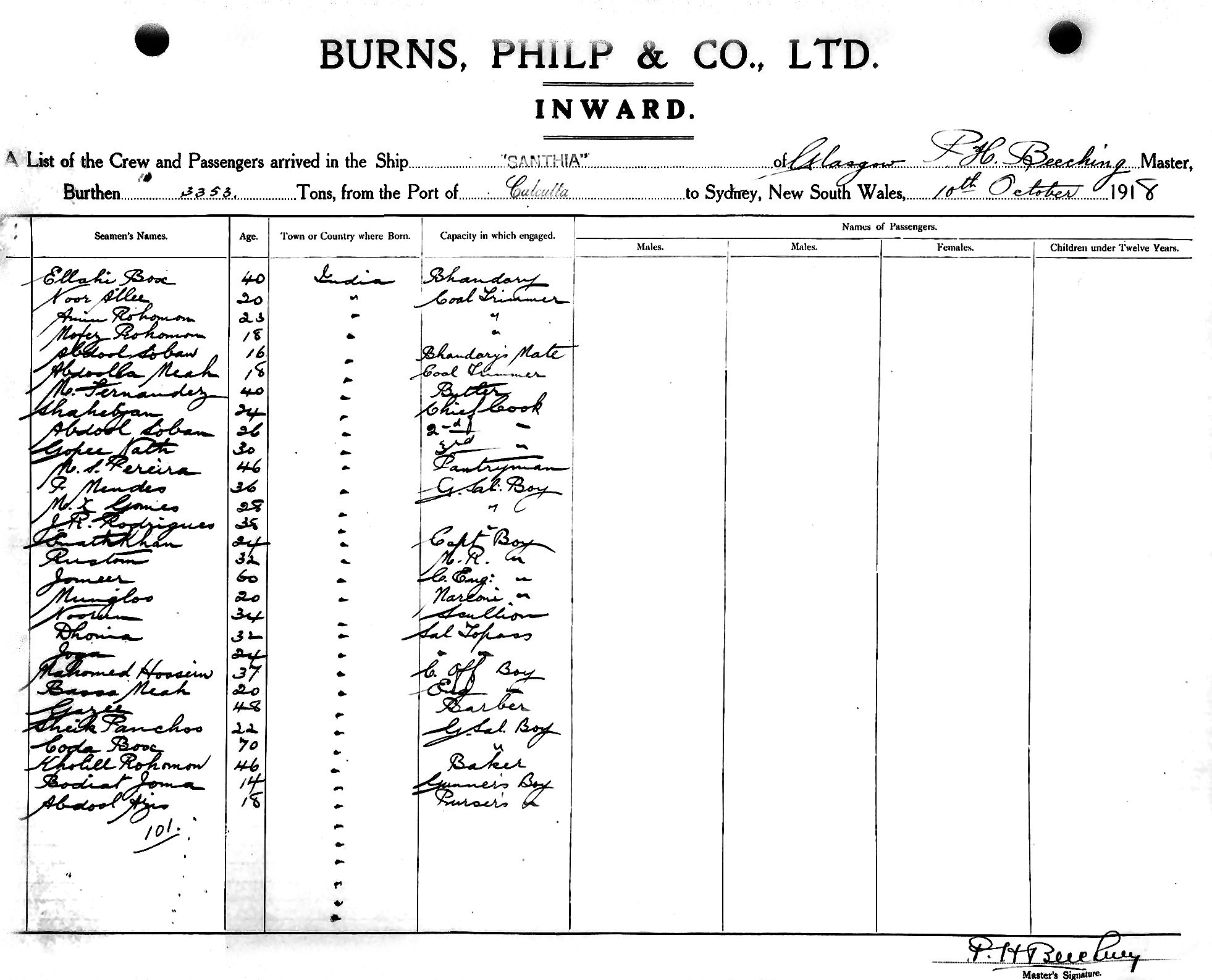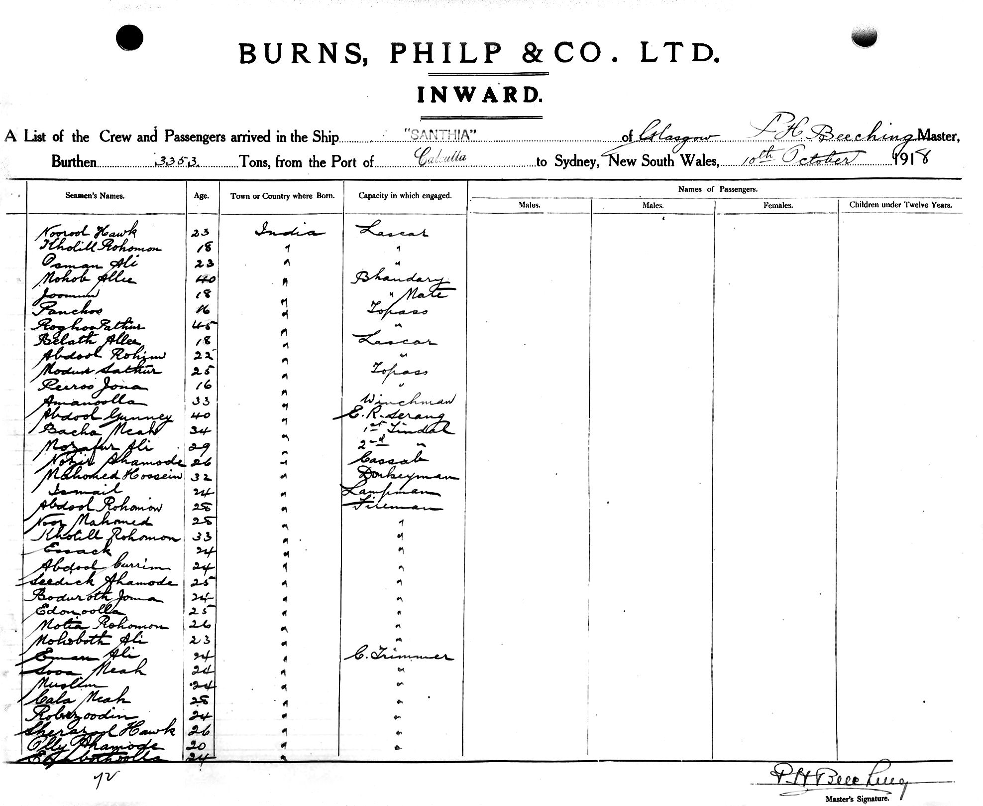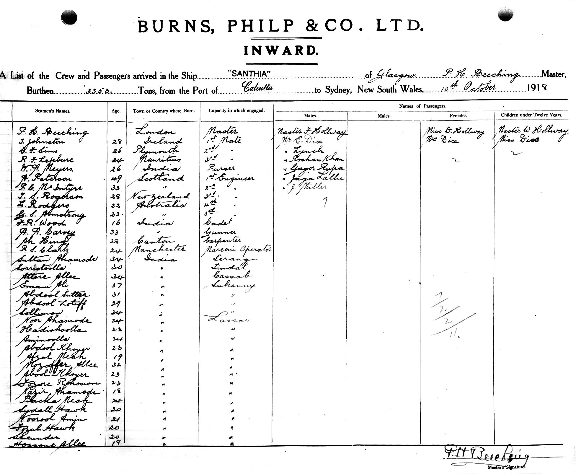 SANTHIAOF GLASGOW, P. H. BEECHING, MASTER, BURTHEN 3353 TONS FROM THE PORT OF CALCUTTA TO SYDNEY, NEW SOUTH WALES, 10TH OCTOBER 1918 |