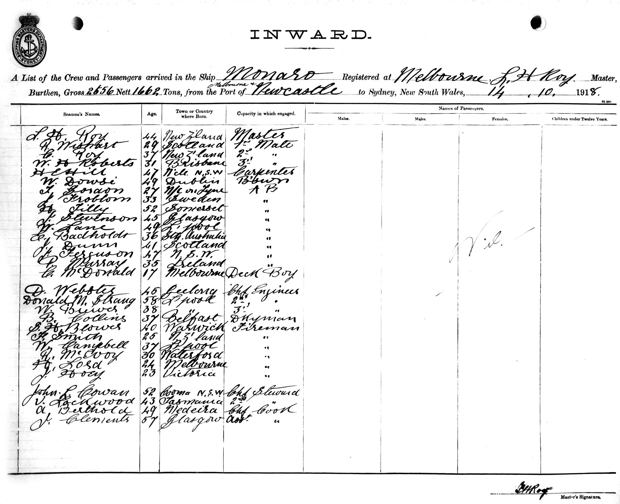Mariners and ships in Australian Waters | MONAROOF MELBOURNE, L. H. ROY, MASTER, BURTHEN 2656/1662 TONS FROM THE PORT OF MELBOURNE via NEWCASTLE TO SYDNEY, NEW SOUTH WALES, 14TH OCTOBER 1918 |