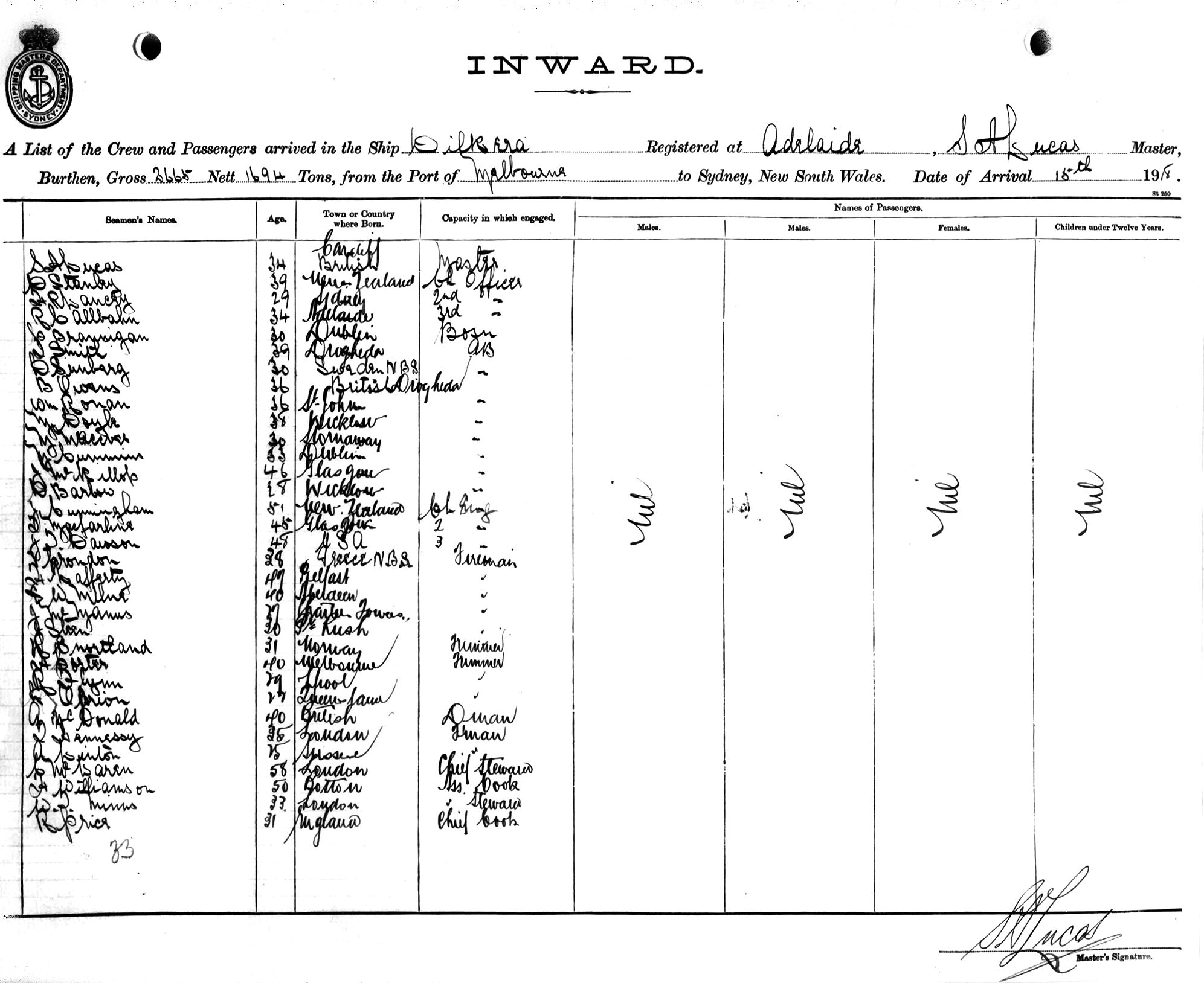 DILKERAOF ADELAIDE, S. A. LUCAS, MASTER, BURTHEN 2665/1694 TONS FROM THE PORT OF MELBOURNE TO SYDNEY, NEW SOUTH WALES, 15TH OCTOBER 1918 |