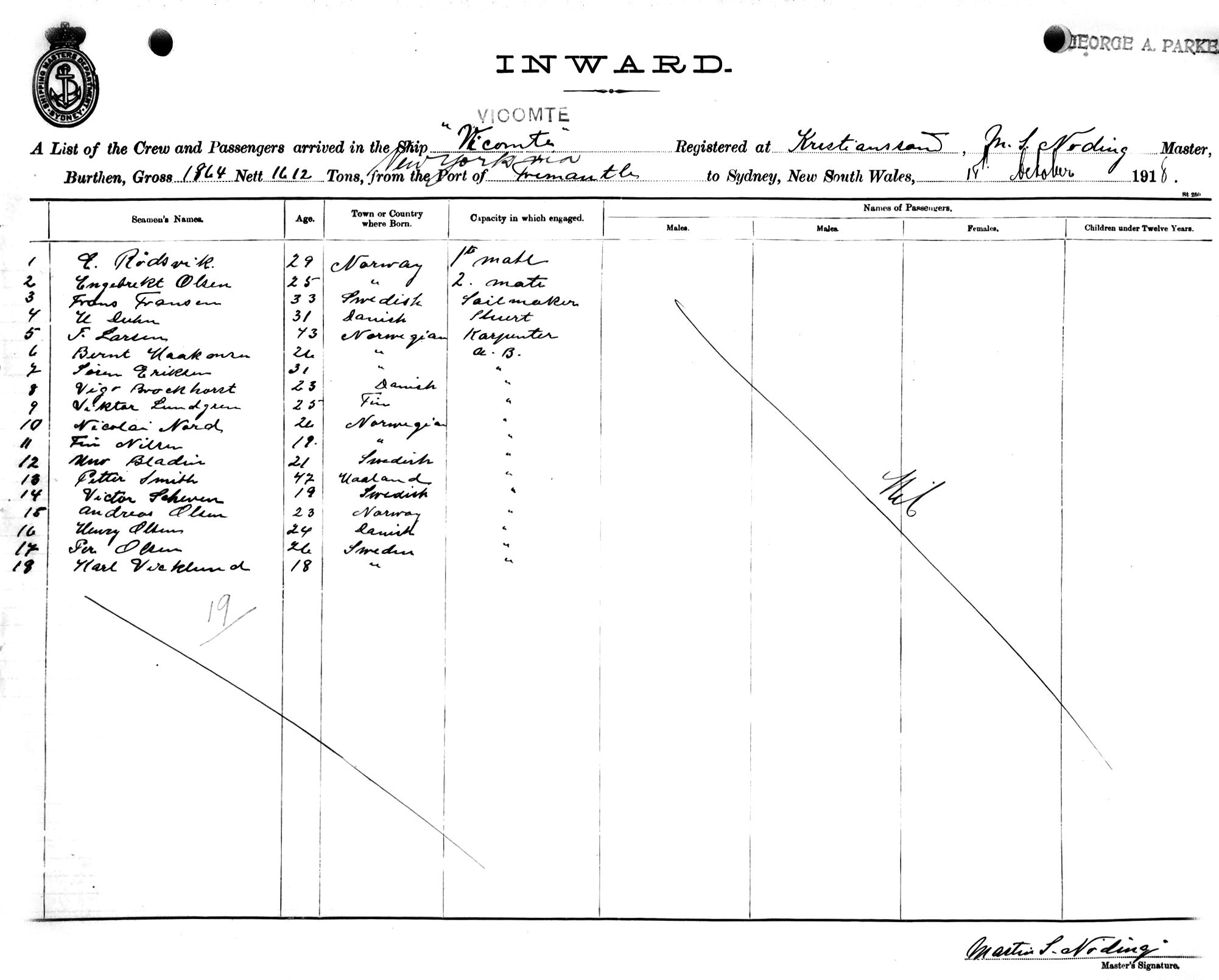 VICOMTEOF KRISTIANSUND, M. S. NODING, MASTER, BURTHEN 1864/1612 TONS FROM THE PORT OF NEW YORK via FREMANTLE TO SYDNEY, NEW SOUTH WALES, 18TH OCTOBER 1918 |