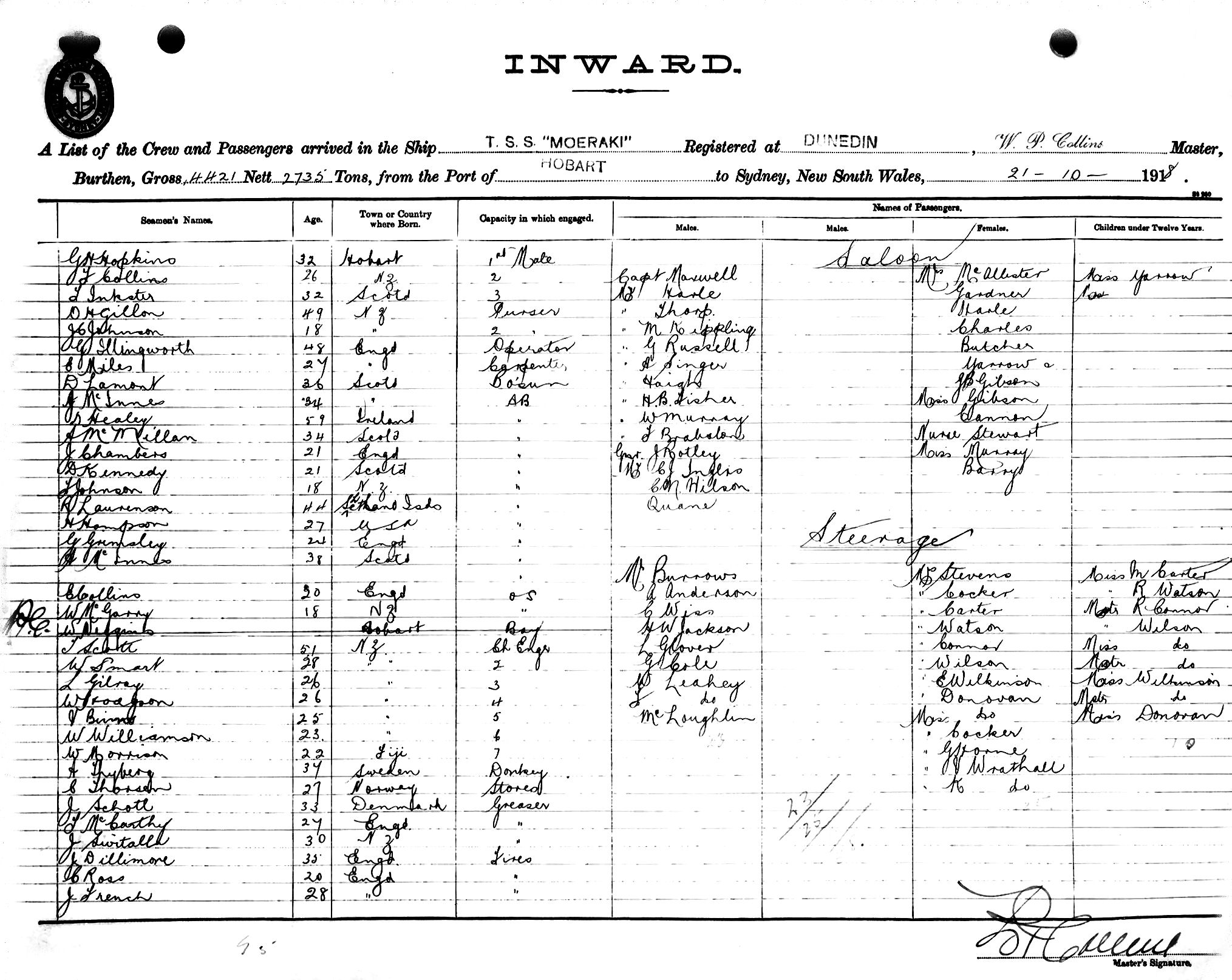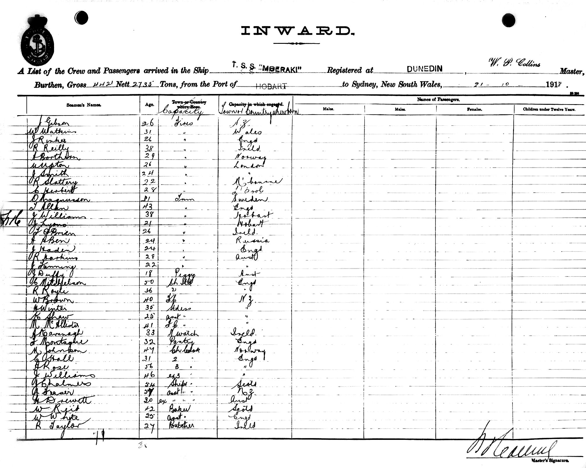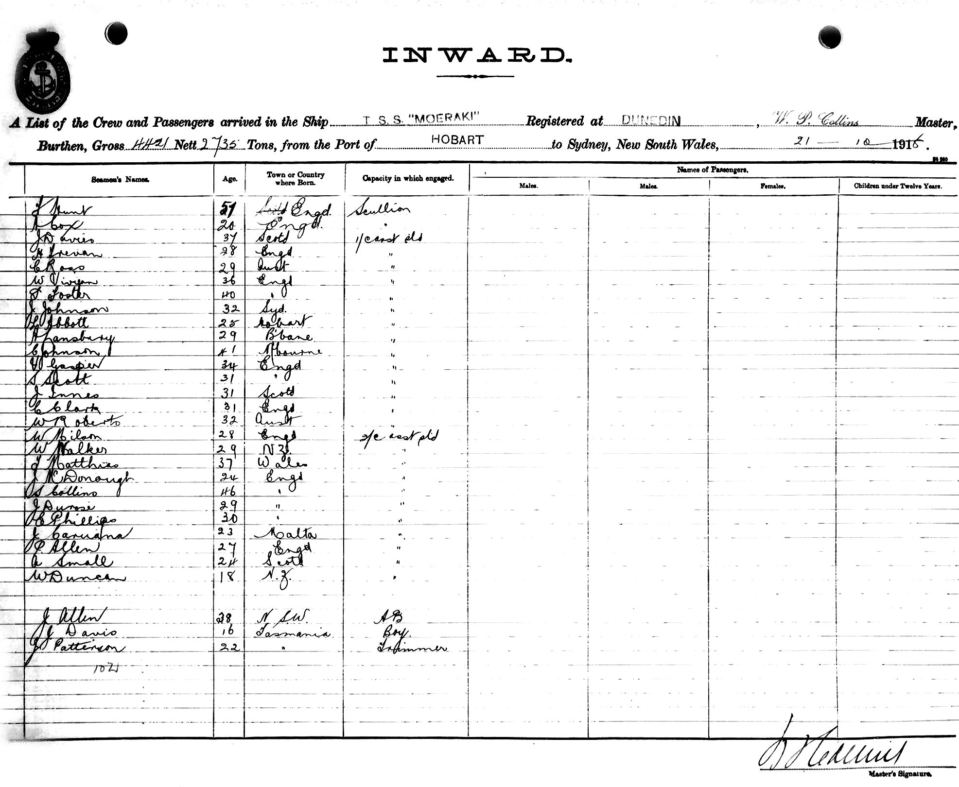 MOERAKIOF DUNEDIN, W. P. COLLINS, MASTER, BURTHEN 4421/2735 TONS FROM THE PORT OF HOBART TO SYDNEY, NEW SOUTH WALES, 21 OCTOBER 1918 |