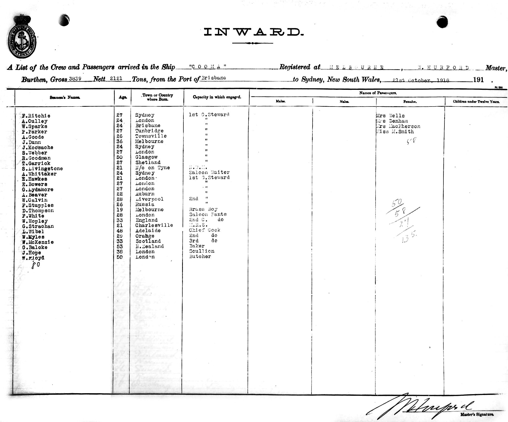 COOMAOF SYDNEY, W. HURFORD, MASTER, BURTHEN 3539/2121 TONS FROM THE PORT OF QUEENSLAND PORTS & BRISBANE TO SYDNEY, NEW SOUTH WALES, 21ST OCTOBER 1918 |