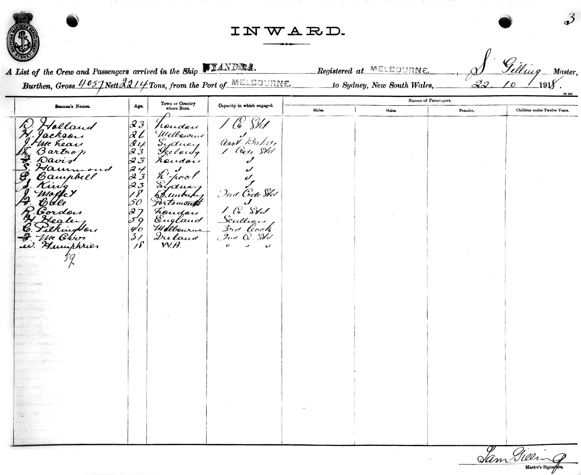 WYANDRAOF MELBOURNE, S. GILLING, MASTER, BURTHEN 4057/2214 TONS FROM THE PORT OF FREMANTLE via PORTS & MELBOURNE TO SYDNEY, NEW SOUTH WALES, 22ND OCTOBER 1918 |