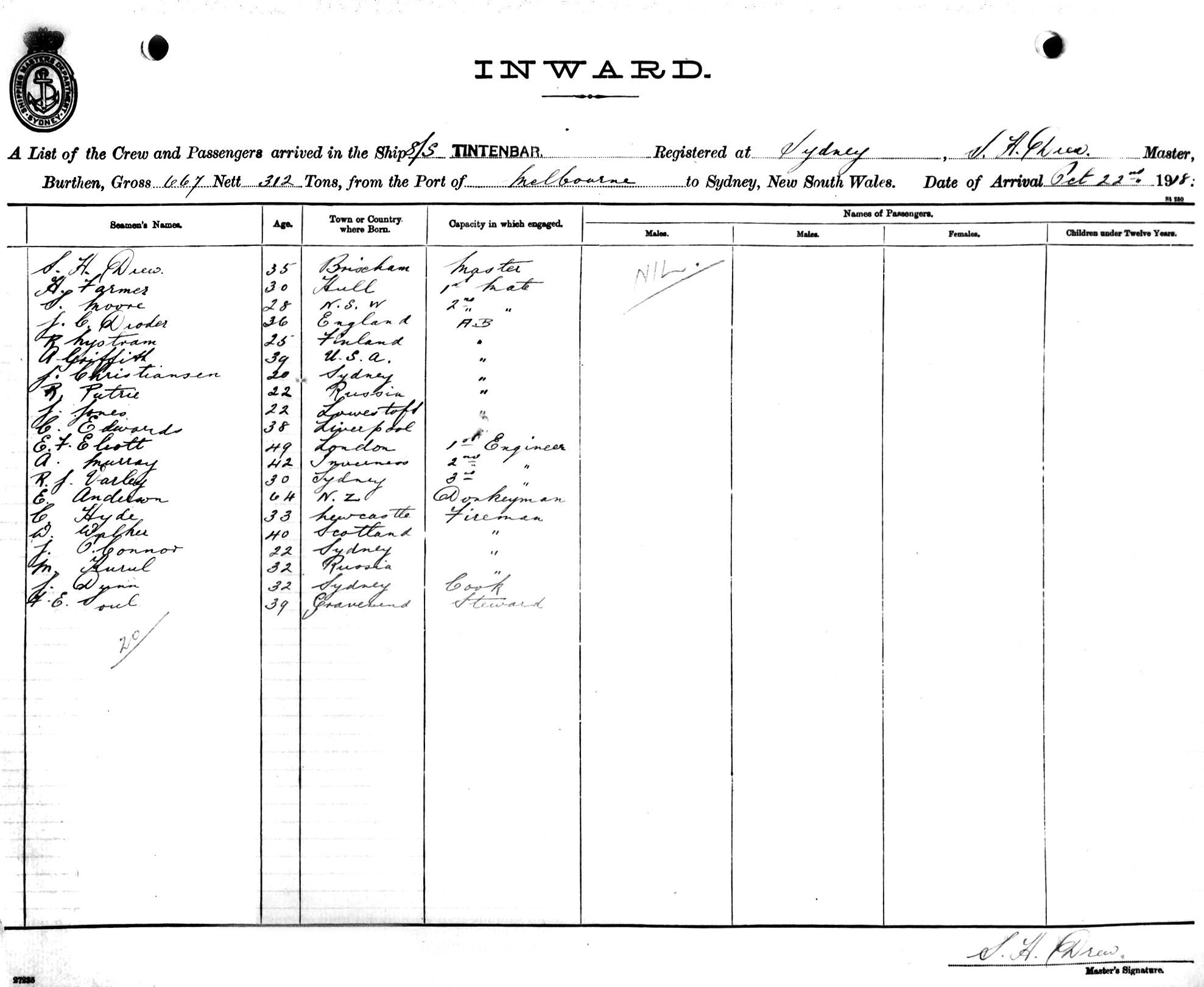 TINTENBAROF SYDNEY, S. H. DREW, MASTER, BURTHEN 667/312 TONS FROM THE PORT OF MELBOURNE TO SYDNEY, NEW SOUTH WALES, 22ND OCTOBER 1918 |