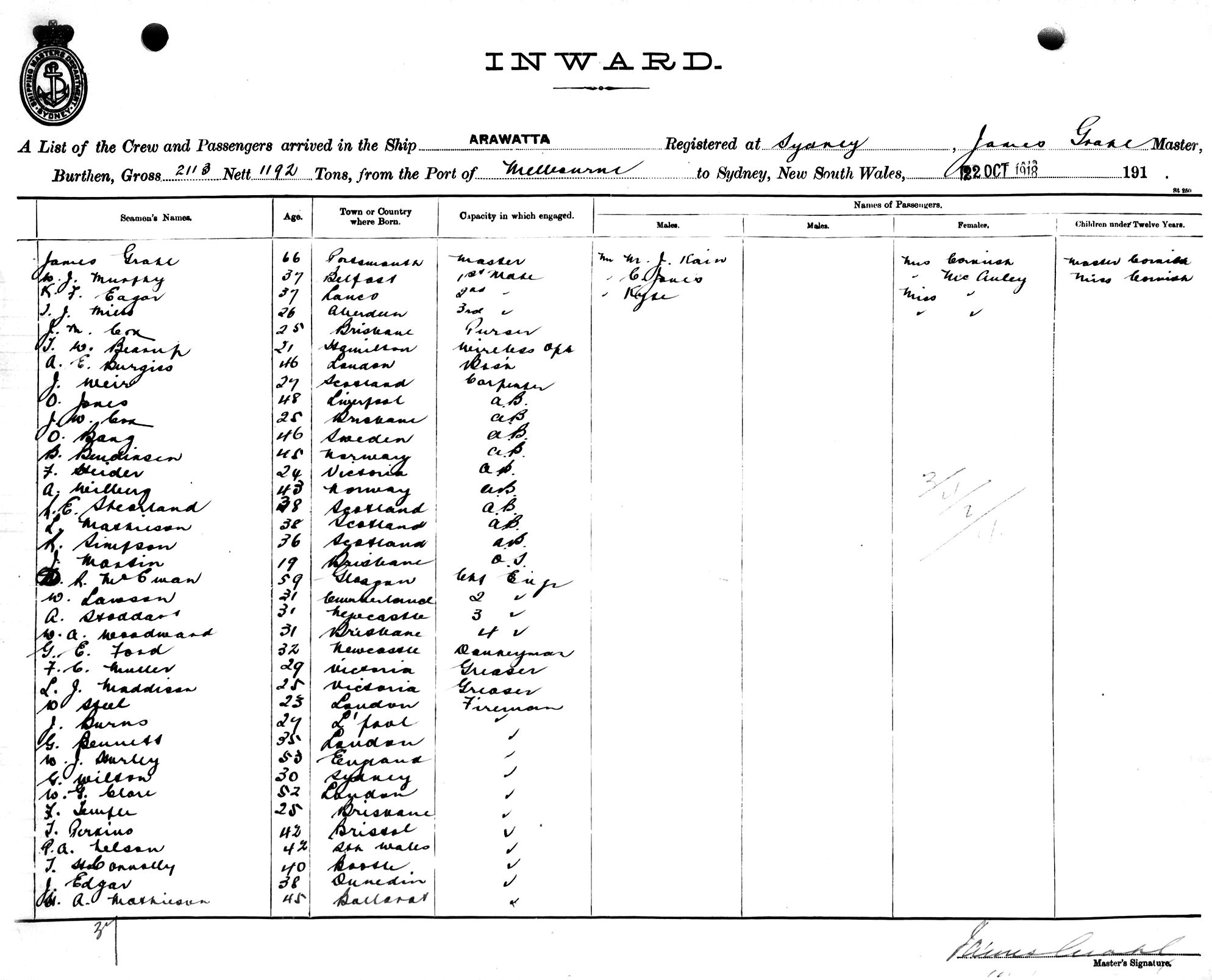 ARAWATTAOF SYDNEY, JAMES GRAHL, MASTER, BURTHEN 2113/1192 TONS FROM THE PORT OF MELBOURNE TO SYDNEY, NEW SOUTH WALES, 22ND OCTTOBER 1918 |
