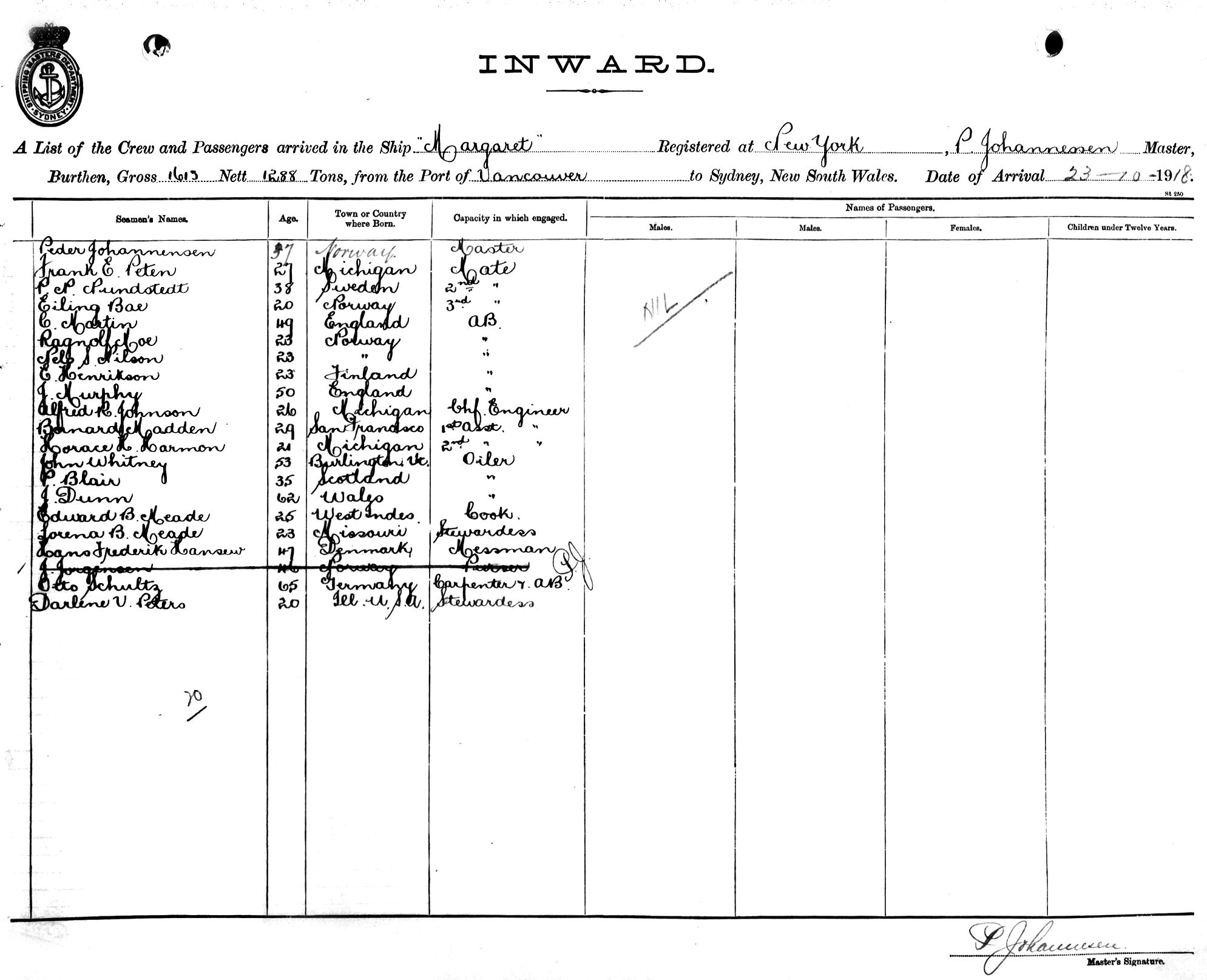 MARGARETOF NEW YORK, P. JOHANNESSEN, MASTER, BURTHEN 1613/1288 TONS FROM THE PORT OF VANCOUVER TO SYDNEY, NEW SOUTH WALES, 23RD OCTOBER 1918 |