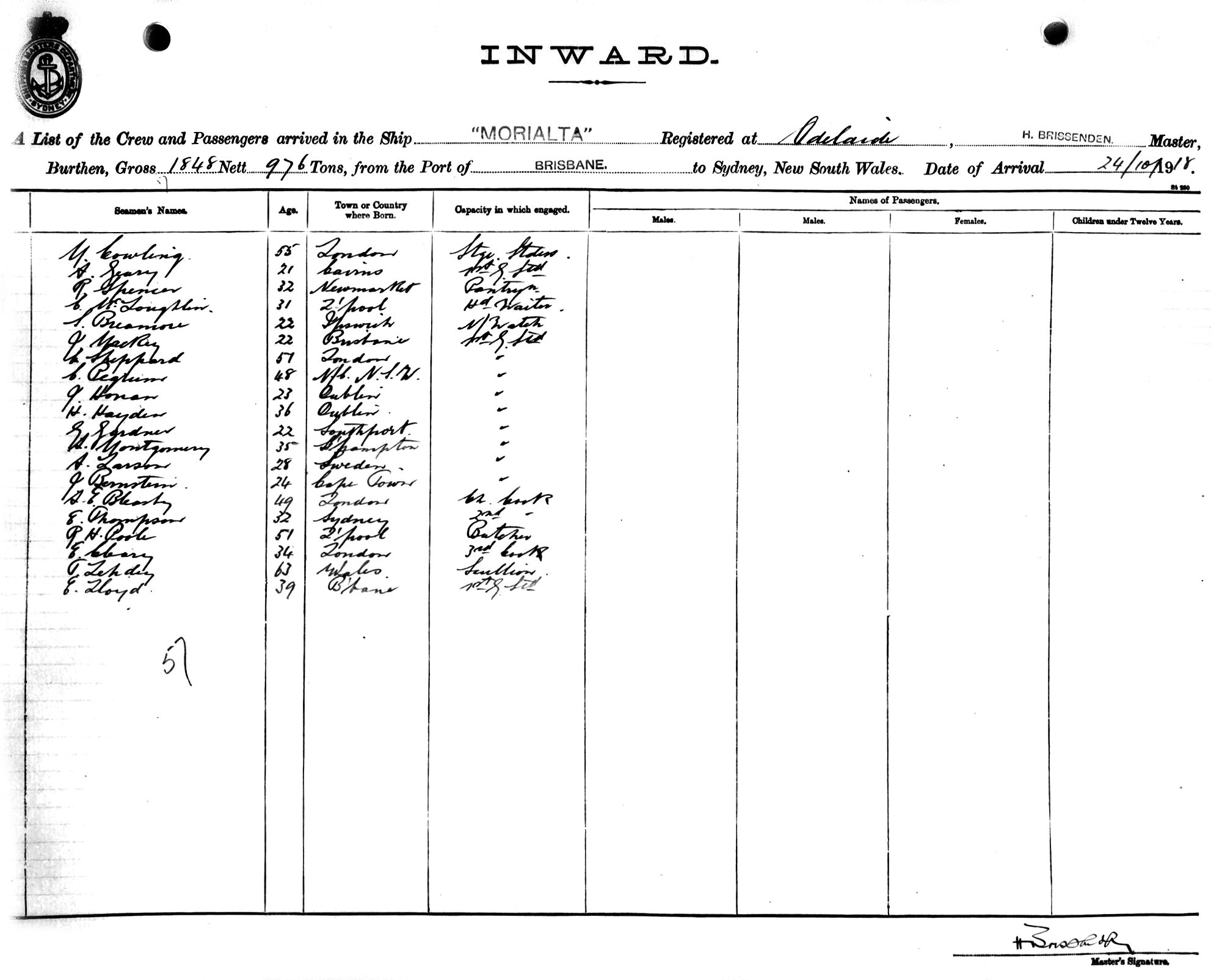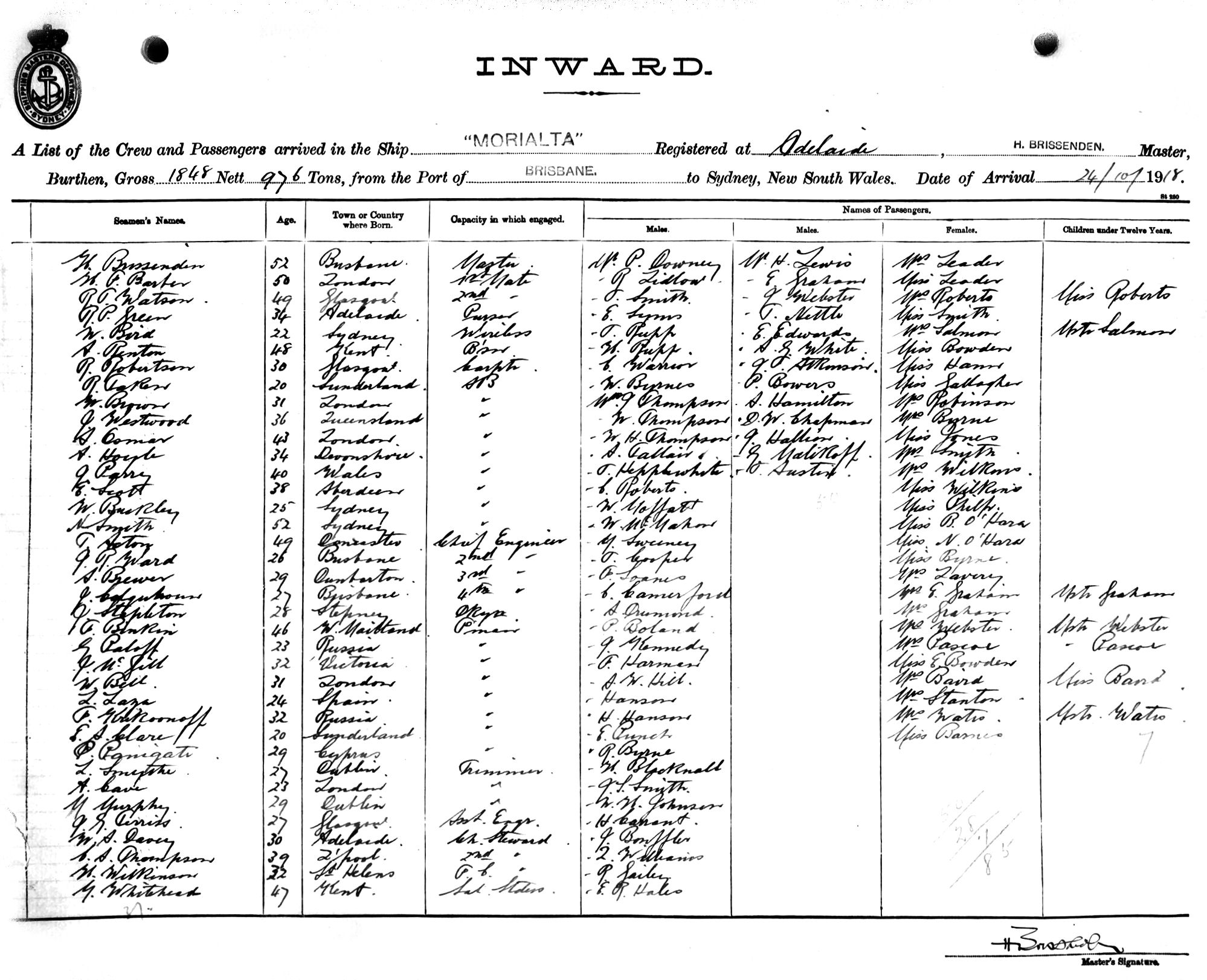 MORIALTAOF ADELAIDE, H. BRISSENDEN, MASTER, BURTHEN 1848/976 TONS FROM THE PORT OF BRISBANE TO SYDNEY, NEW SOUTH WALES, 23TH OCTOBER 1918 |
