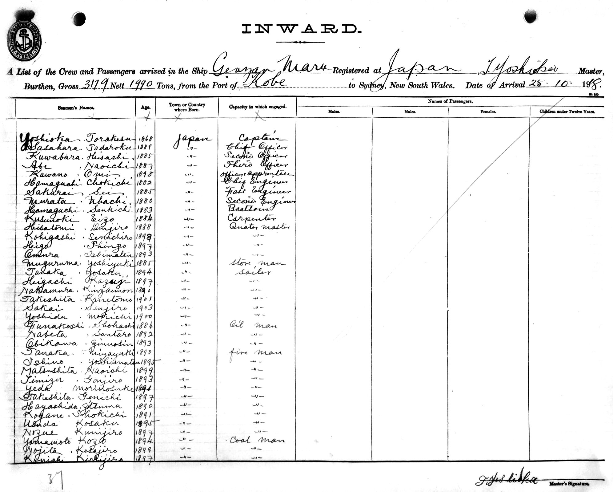 GENZAN MARUOF JAPAN, T. YOSHIOKA, MASTER, BURTHEN 3179/1990 TONS FROM THE PORT OF KOBE, JAPAN TO SYDNEY, NEW SOUTH WALES, 25TH OCTOBER 1918 |