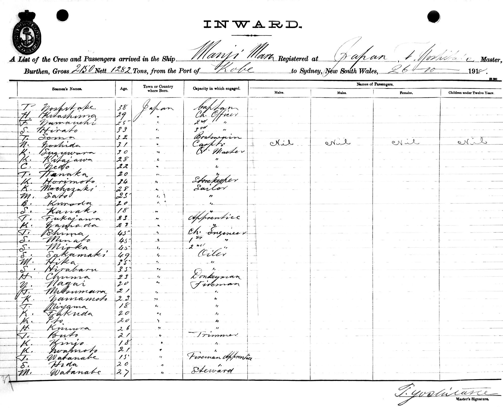 MANJI MARUOF JAPAN, T. YOSHITAKE, MASTER, BURTHEN 2150/1282 TONS FROM THE PORT OF KOBE TO SYDNEY, NEW SOUTH WALES, 26TH OCTOBER 1918 |