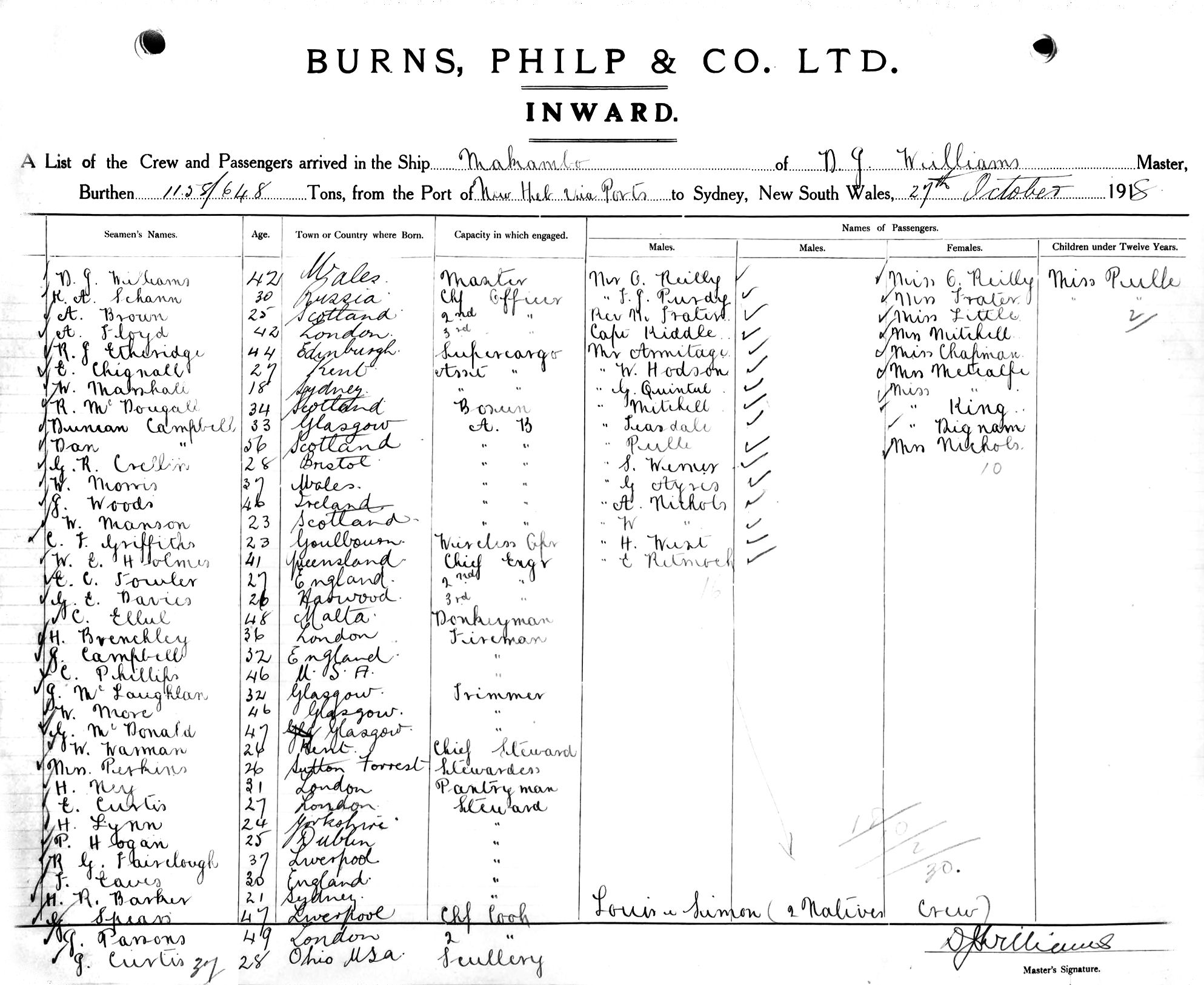 MAKAMBOOF SYDNEY, F. WILLIAMS, MASTER, BURTHEN 1158/648 TONS FROM THE PORT OF NEW HEBRIDES via PORTS TO SYDNEY, NEW SOUTH WALES, 27TH OCTOBER 1918 |