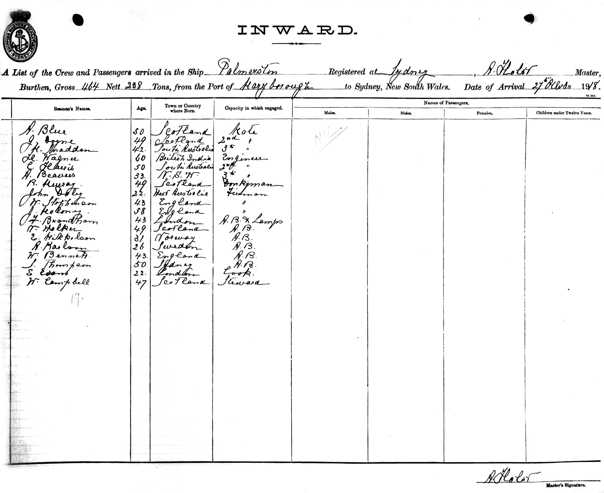 PALMERSTONOF SYDNEY, A. HOLST, MASTER, BURTHEN 464/238 TONS FROM THE PORT OF MARYBOROUGH TO SYDNEY, NEW SOUTH WALES, 27TH OCTOBER 1918 |