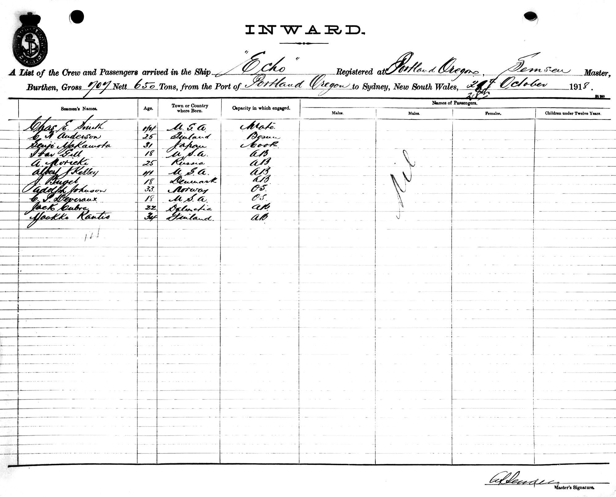 ECHOOF PORTLAND, OREGON, C. S. SEMSEN, MASTER, BURTHEN 707/650 TONS FROM THE PORT OF PORTLAND, OREGON TO SYDNEY, NEW SOUTH WALES, 28TH OCTOBER 1918 |