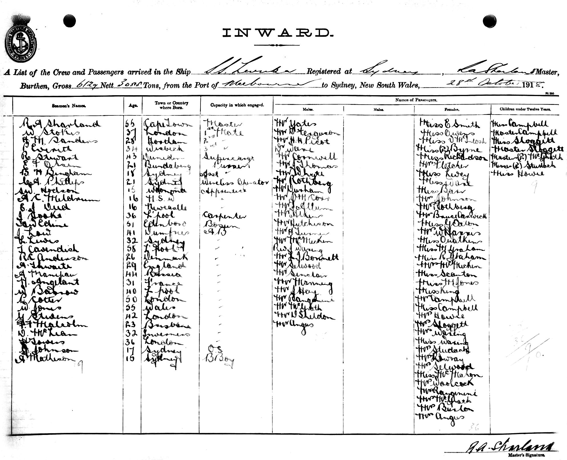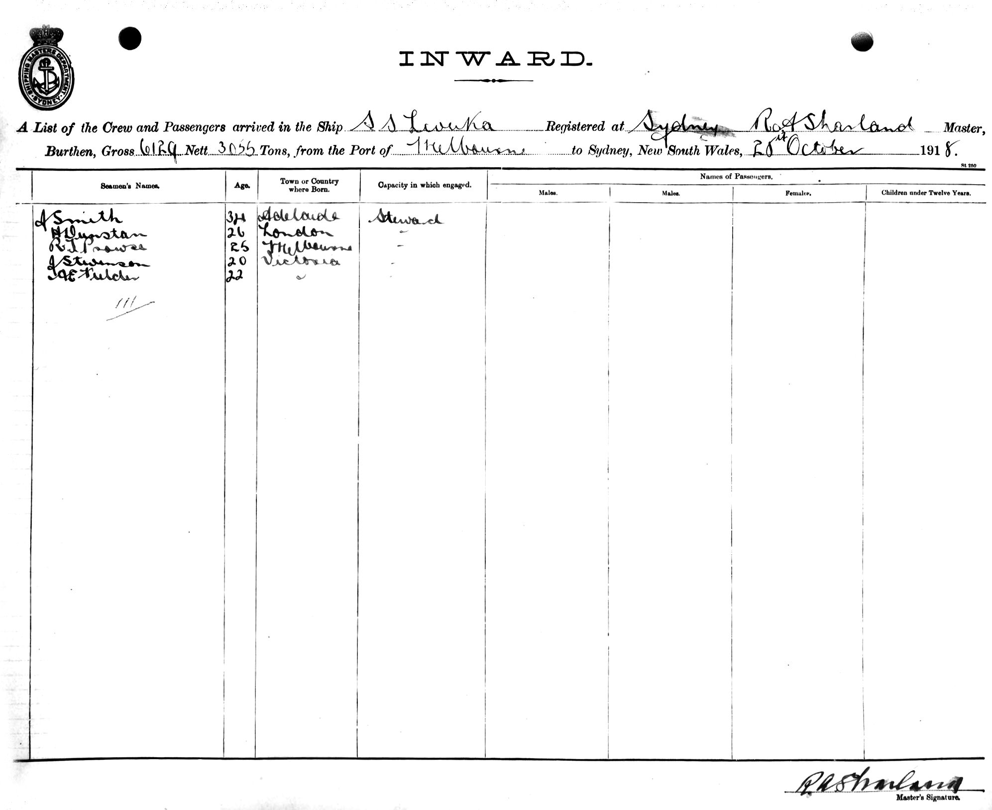 LEVUKAOF SYDNEY, R. A. SHARLAND, MASTER, BURTHEN 6129/3055TONS FROM THE PORT OF MELBOURNE TO SYDNEY, NEW SOUTH WALES, 28TH OCTOBER 1918 |