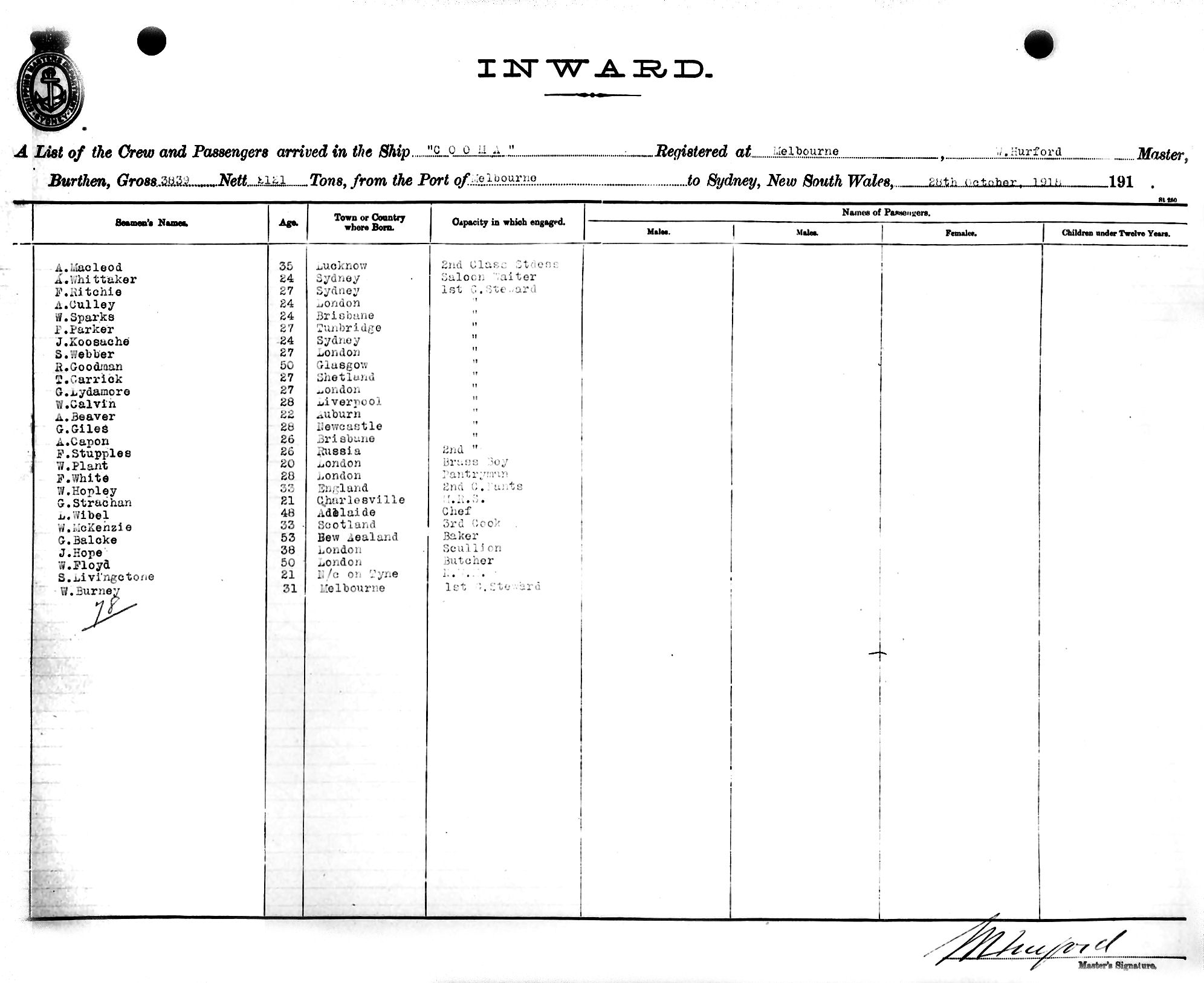 COOMAOF MELBOURNE, W. HURFORD, MASTER, BURTHEN 3839/2121 TONS FROM THE PORT OF MELBOURNE TO SYDNEY, NEW SOUTH WALES, 28TH OCTOBER 1918 |