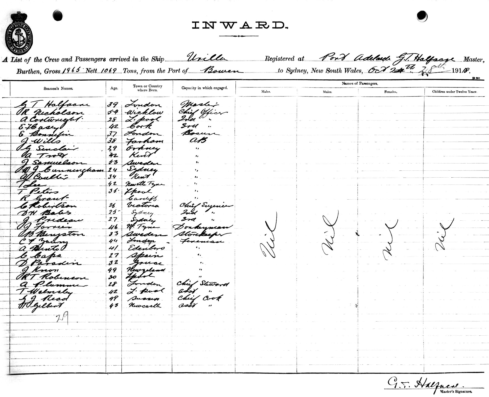 URILLAOF PORT ADELAIDE, G. T. HALFACRE, MASTER, BURTHEN 1965/1069 TONS FROM THE PORT OF BOWEN TO SYDNEY, NEW SOUTH WALES, 28TH OCTOBER 1918 |