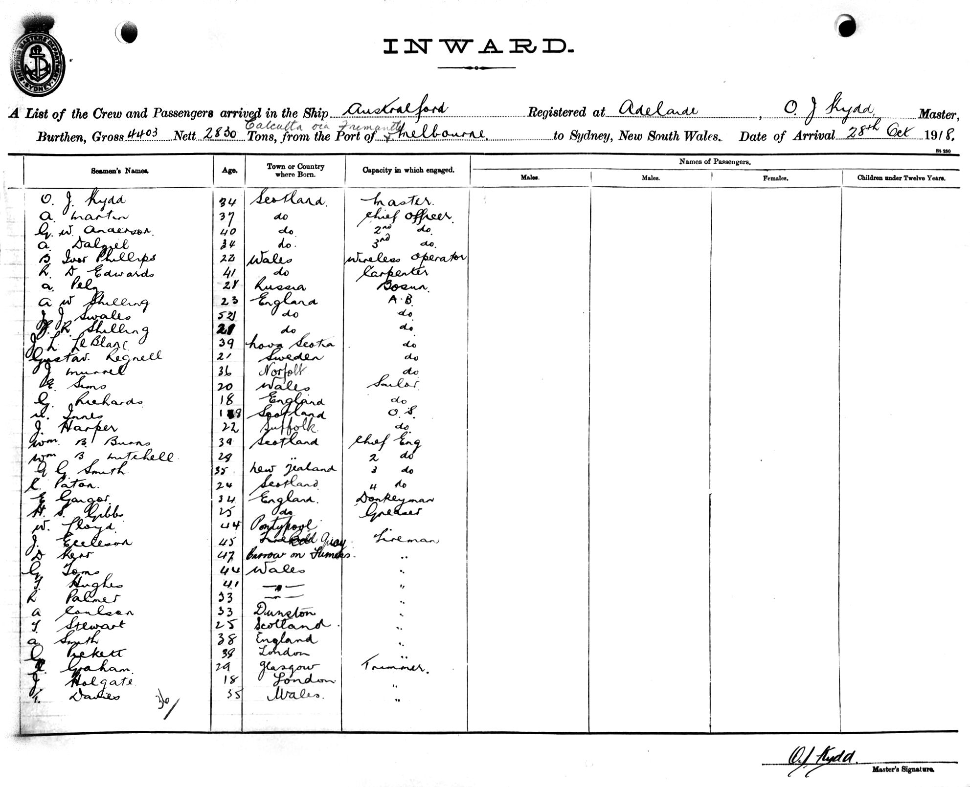 AUSTRALFORDOF ADELAIDE, O. J. KYDD, MASTER, BURTHEN 4403/2830 TONS FROM THE PORT OF CALCUTTA via FREMANTLE & MELBOURNE TO SYDNEY, NEW SOUTH WALES, 28TH OCTOBER 1918 |