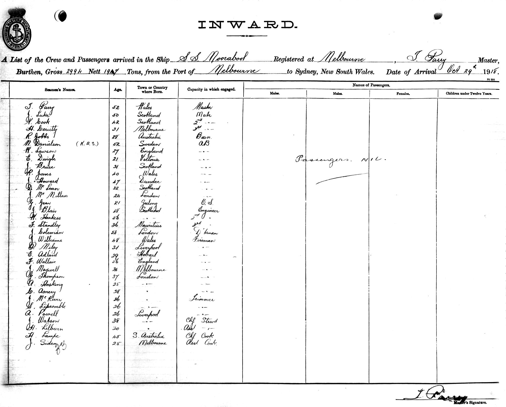 MOORABOOLOF MELBOURNE, T PARRY, MASTER, BURTHEN GROSS 2994 TONS, NETT 1947 TONS FROM THE PORT OF MELBOURNE TO SYDNEY, NEW SOUTH WALES, 29 OCTOBER 1918 |