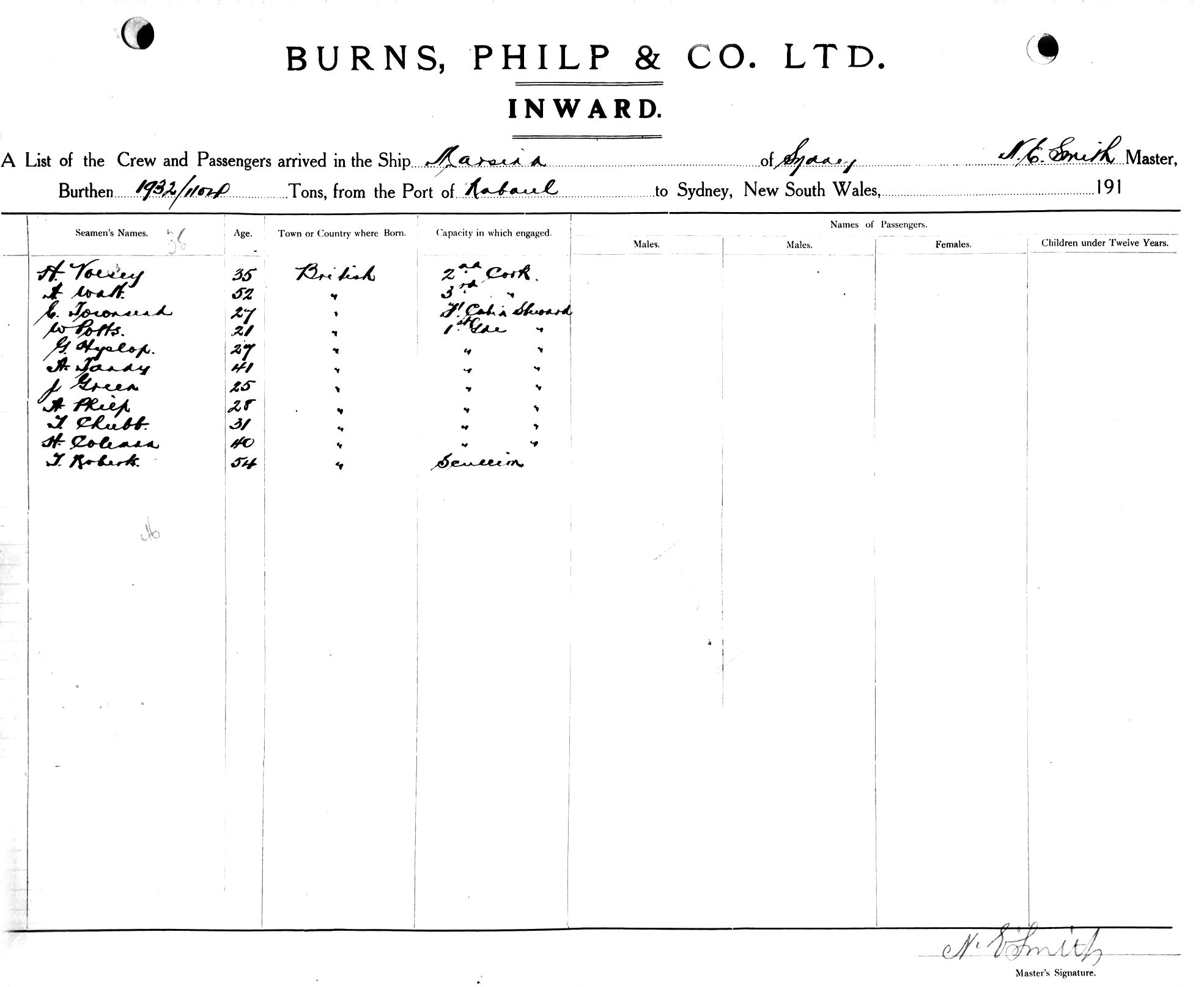 MARSINAOF SYDNEY, N. E. SMITH, MASTER, BURTHEN 1932/1104 TONS FROM THE PORT OF RABAUL TO SYDNEY, NEW SOUTH WALES, 3RD JANUARY 1900