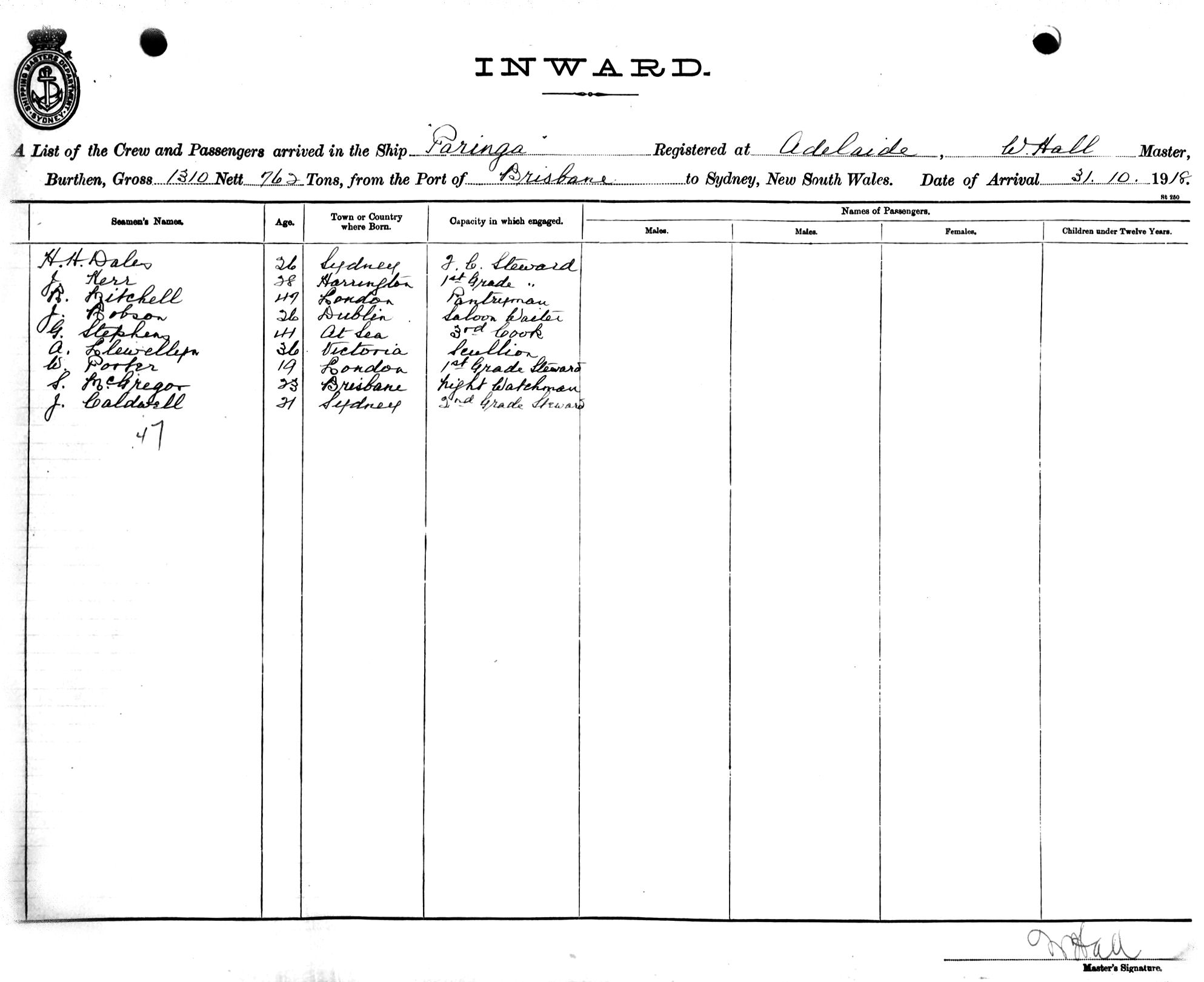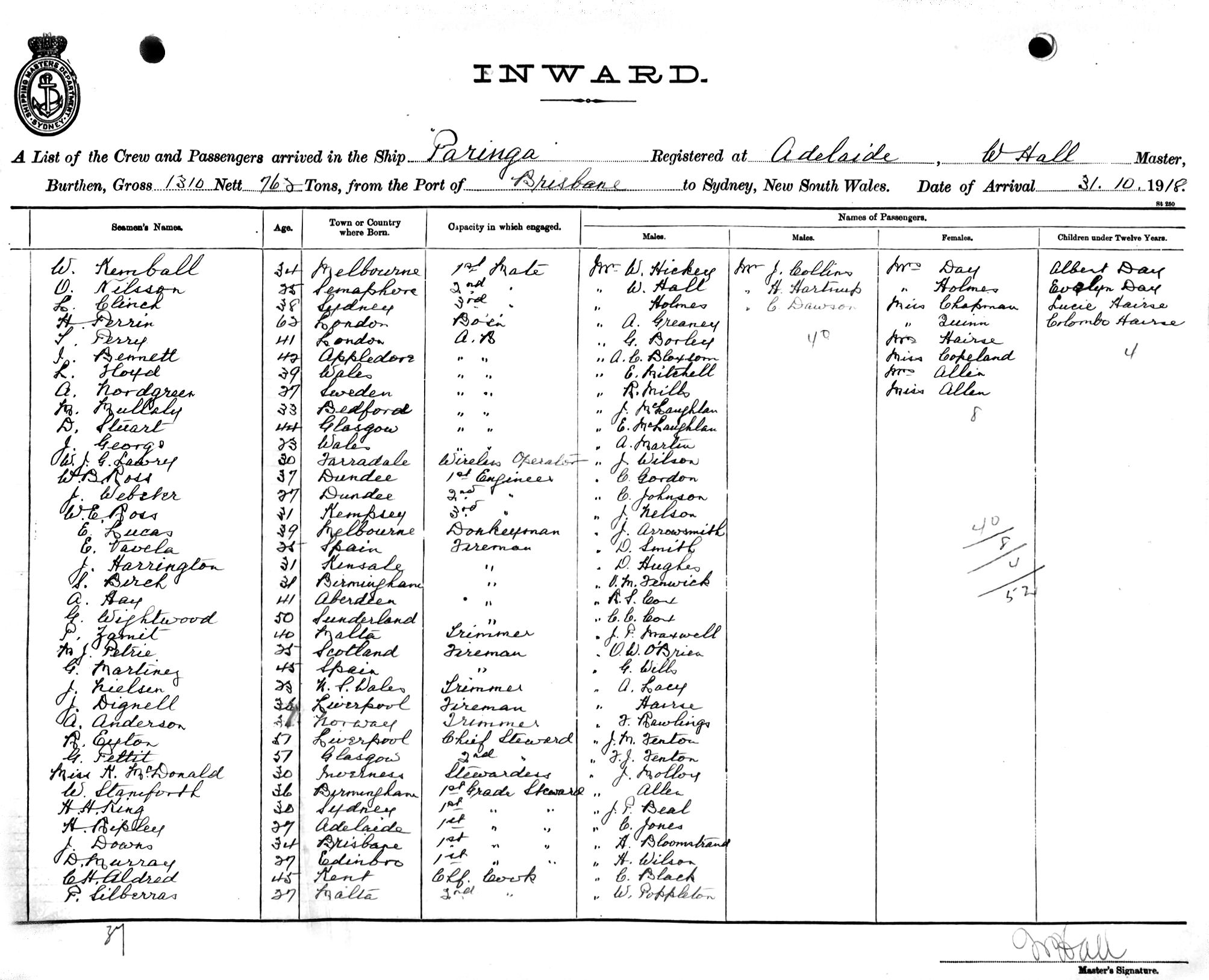 PARINGAOF ADELAIDE, W. HALL, MASTER, BURTHEN 1310/762 TONS FROM THE PORT OF BRISBANE TO SYDNEY, NEW SOUTH WALES, 31ST OCTOBER 1918 |