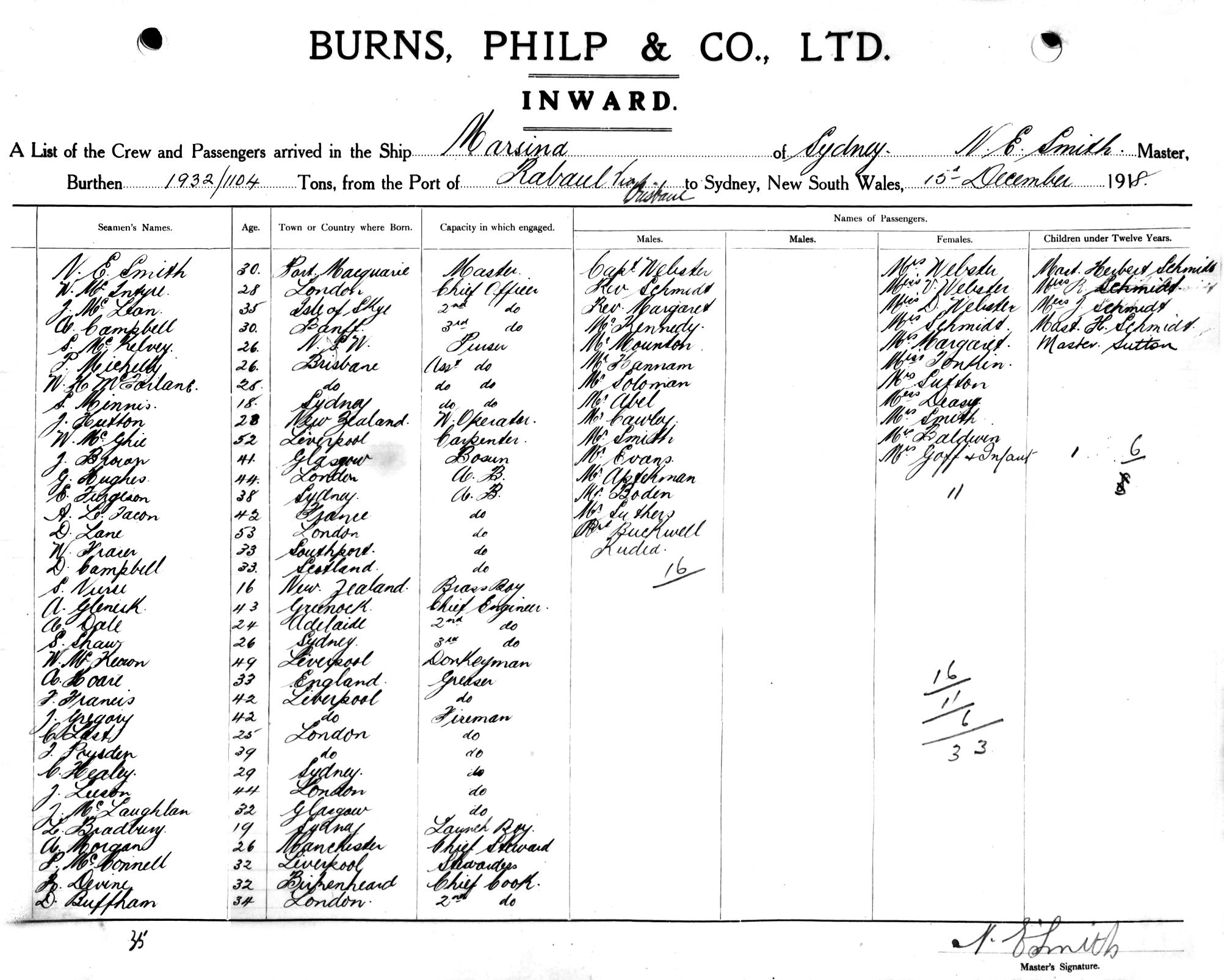 MARSINAOF SYDNEY, N.E. SMITH, MASTER, BURTHEN 1932/1104 TONS FROM THE PORT OF RABAUL via BRISBANE TO SYDNEY, NEW SOUTH WALES, 15TH DECEMBER 1918 |