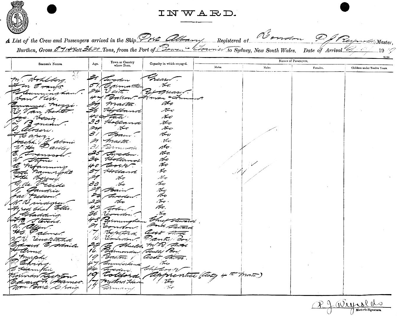 PORT ALBANYOF LONDON, P. J. REYNOLDS, MASTER, BURTHEN 5713/3620 TONS FROM THE PORTS OF BOWEN & TOWNSVILLE via NEWCASTLE TO SYDNEY, NEW SOUTH WALES, 9TH SEPTEMBER 1919 |