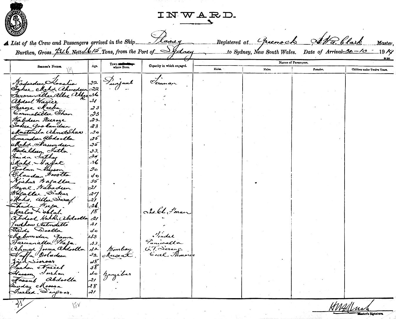 Source: State Records Authority of New South Wales: Shipping Master's Office; Passengers Arriving 1855 - 1922; NRS13278, [X439] reel 2107, 2108. Transcribed by Barry Collin. Proofread by Lyn & Maurie.