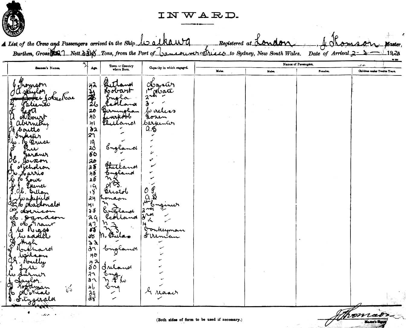 WAIKAWAOF LONDON, J. THOMSON, MASTER, BURTHEN 4027/3548 TONS FROM THE PORTS OF VANCOUVER & SAN FRANCISCO TO SYDNEY, NEW SOUTH WALES, 2ND MARCH 1920 |