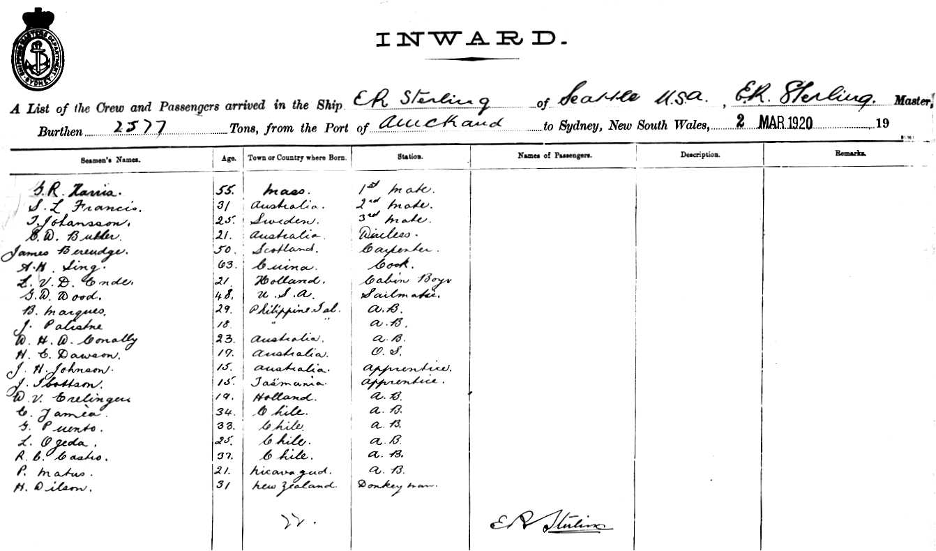 E R STERLINGOF SEATTLE, U.S.A., E. R. STERLING, MASTER, BURTHEN 2577 TONS FROM THE PORT OF AUCKLAND TO SYDNEY, NEW SOUTH WALES, 2ND MARCH 1920 |